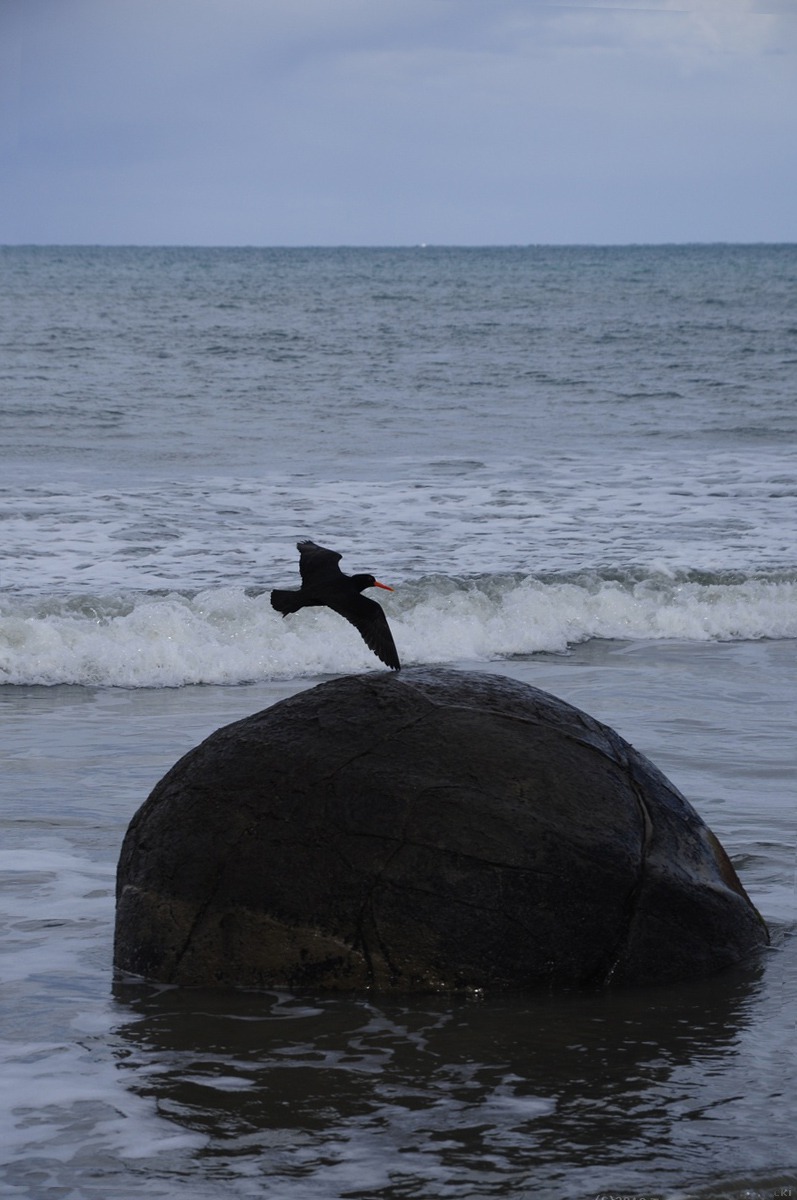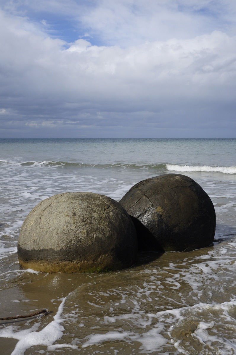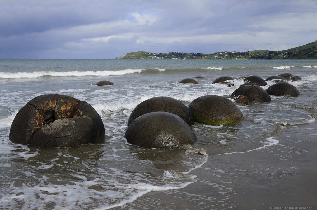 Jedziemy na północ po drodze zatrzymując się przy plaży Moreaki, na której rozrzucone są wielkie kuliste konkrencje o średnicy przekraczajacej dwa metry.