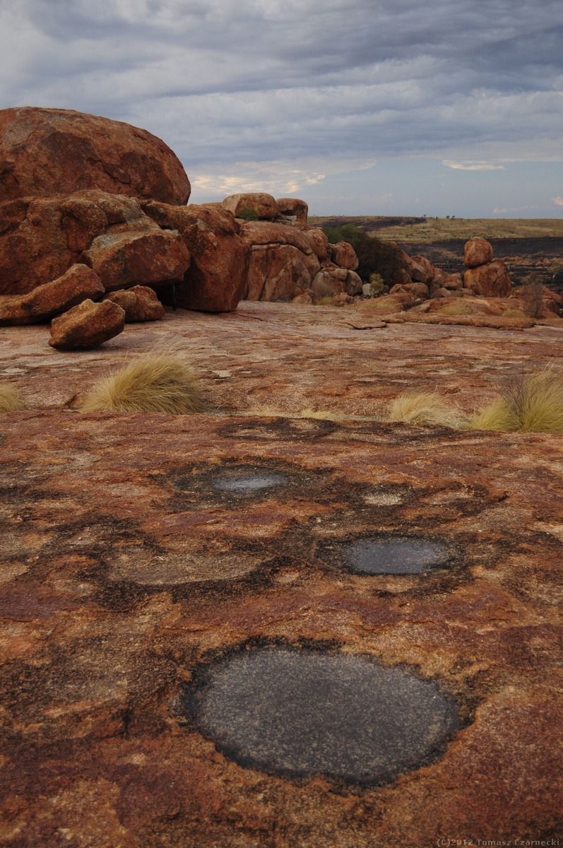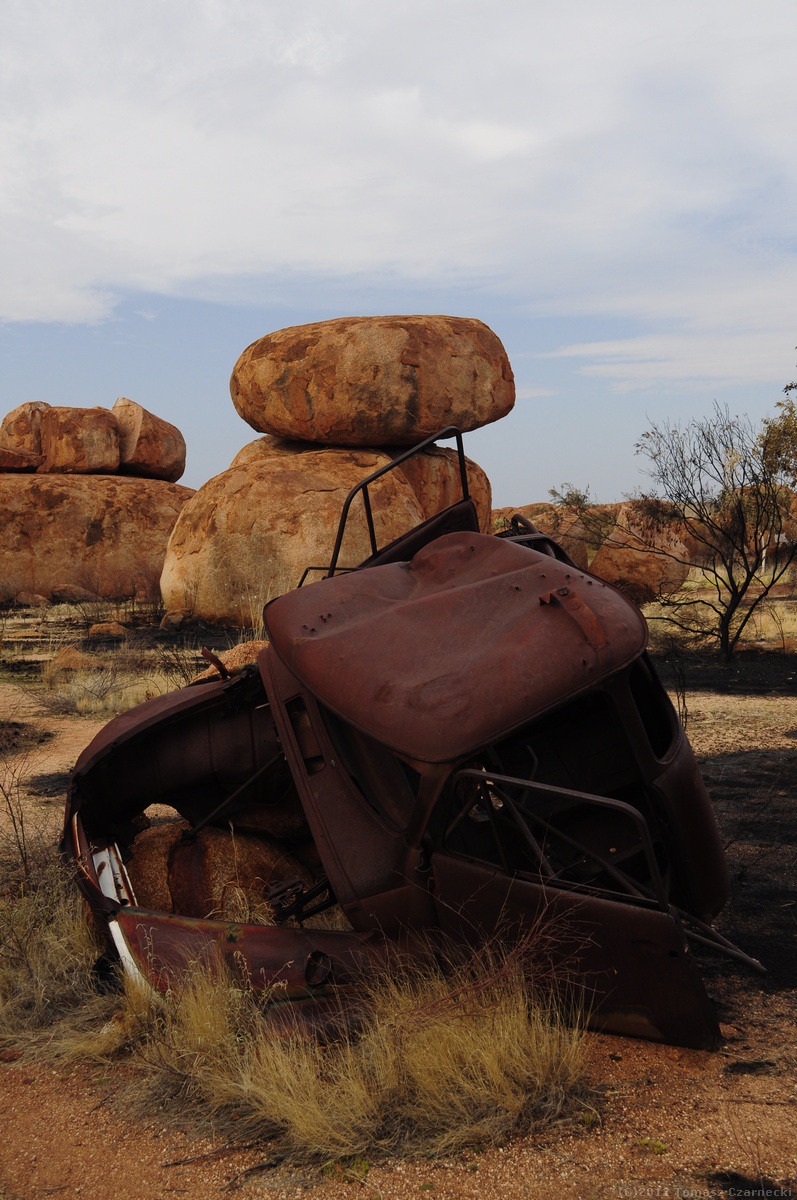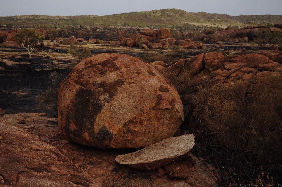 W efekcie lekkiej paniki wywołanej wyciem i wizytą dingo a potem odległą burzą większość ekipy budzi się w samochodzie. Szacun dla tych, którzy zaufali w.c. kierownikowi i wyspali się komfortowo pod gwiaździstym niebem australii. Po raz kolejny wspinam się na pakę naszego Landcruisera i pakują plecaki, walizy, śpiwory. Do wprawy jeszcze daleko, ale przynajmniej tym razem nie ląduję zawieszony głową w dół w szczelinie drzwi. Potem ruszamy pomiędzy kule bilardowe diabła. Niezwykłe formacje skalne zadziwiają tym, że wciąż stoją. Kule są olbrzymie, zawieszone często na pochyłych podstawach. Czekające zdawałoby się na tchnienie wiatru by z hukiem potoczyć się w dół, na rudą ziemię, pomiędzy czarne od płomieni szczątki drzew i krzewów.
