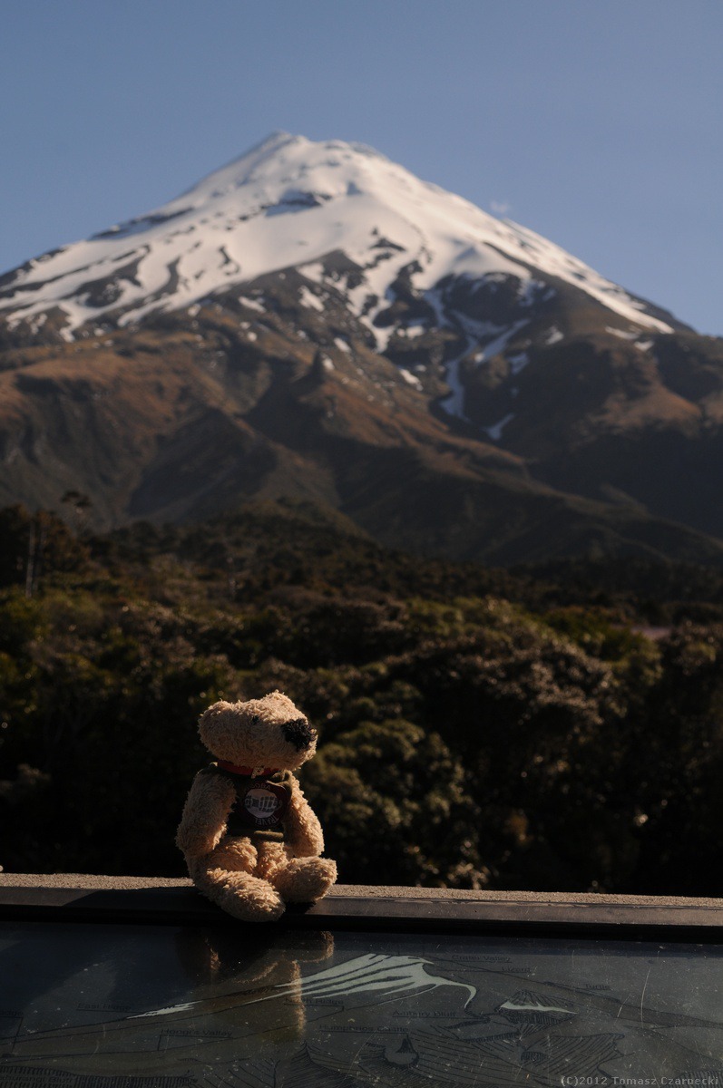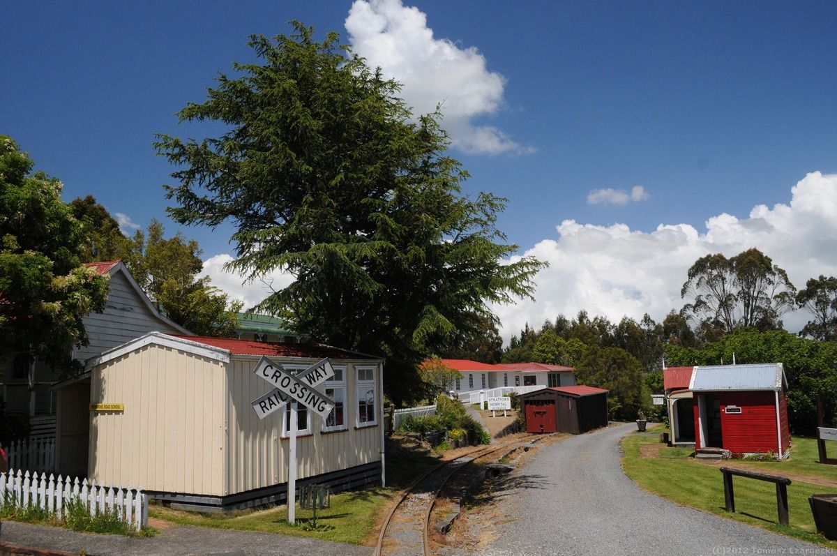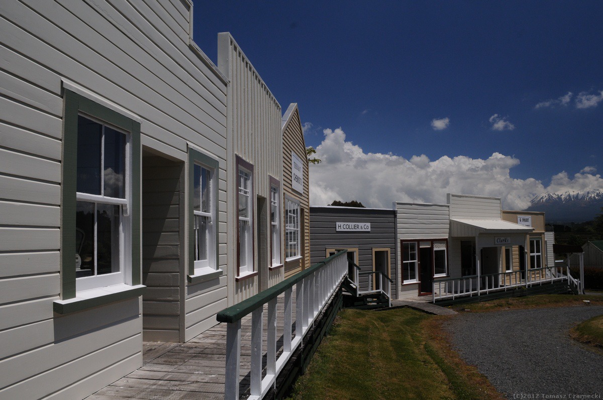 Choć w planach mamy wejście na Mt Taranaki (2518 m npm) okazuje się, że w partiach szczytowych nadal panują warunki zimowe. Wejście wymaga użycie raków, czekanów oraz – przede wszystkim – doświadczenia we wspinaczce w lodzie. Oznacza to, że musimy zrezygnować z wejścia na szczyt. Na szczęście Park Narodowy Egmont to nie tylko wulkan, ale również piękne, bogate deszczowe lasy pierwotne, nienaruszone przez ludzi, wodospady. Dzień zaczynamy od wizyty w Taranaki Pioneer Village – skansen, w którym zgromadzono około 40 budowli z przełomu XIX i XX wieku obrazujących życie osadników w tym rejonie. Jest tu m.in. szpital, szkoła, sklepiki, studio fotografa, stacja telegraficzna. W tle wznosi się piękna, ośnieżona góra, a przed małymi domkami kwitną łany strokrotek.