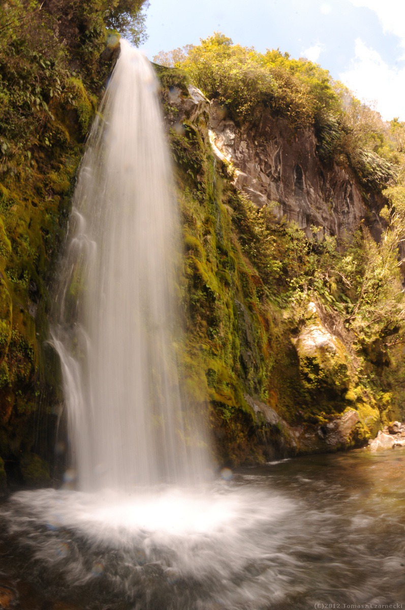 Wąską, krętą drogą wiodącą przez gęsty las, lawirującą wokół masywnych drzew pędzimy do centrum odwiedzających przy wodospadzie Dawson (Te Rere ‘O’ Noke). Do samego wodospadu ścieżką idzie się 10 minut. Malownicza 18-metrowa kaskada wypełnia szumem spadającej wody niewielką dolinę, którą porastają przede wszystkim drzewiaste paprocie. Z Dawson Falls Visitor Center jedziemy do North Egmont skąd ekipa rusza na półtoragodzinny trekking pod górę.