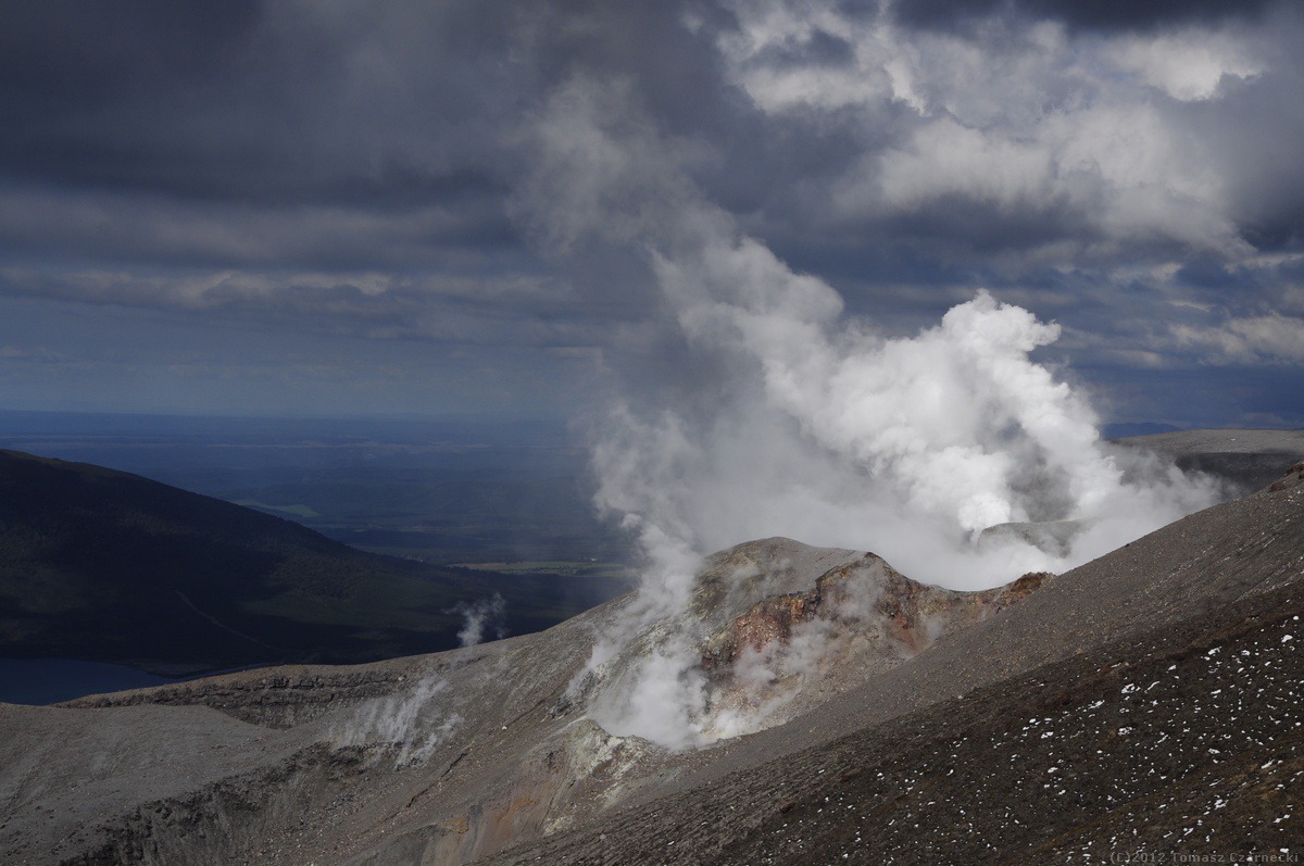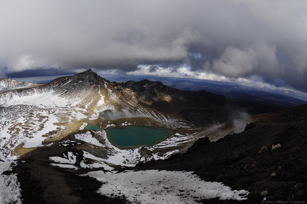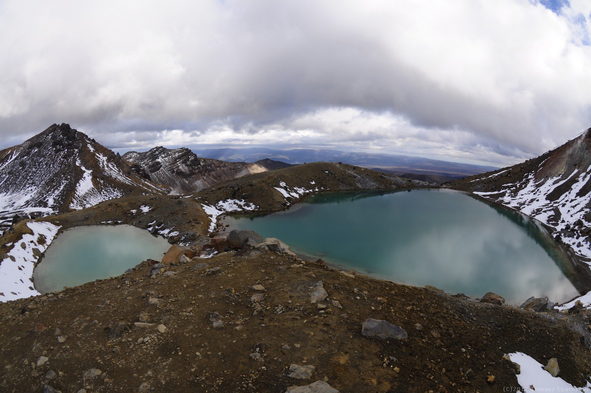 Ze szlaku rozciąga się wspaniały widok na stożki wulkaniczne i jeziora – wśród nich Taupo – na północ od nas. Nad nami po prawej góruje północny krater Tongariro, po lewej dymi masyw krateru Te Māri. Im wyżej tym więcej leży śniegu. Roślinność robi się alpejska, wokół widać coraz więcej wyglądających na świeże bomb wulkanicznych i kilkumetrowej średnicy kraterów po uderzeniach przez wyrzucone przez wulkan bomby. Przez przełęcz pomiędzy kraterami docieramy nad leżące nad centralnym kraterem cudownie piękne Niebieskie jezioro wypełniające… kolejny krater. Tu już nie ma innych turystów, a zarówno mnie jak i Stefana dopada piękno tego krajobrazu.