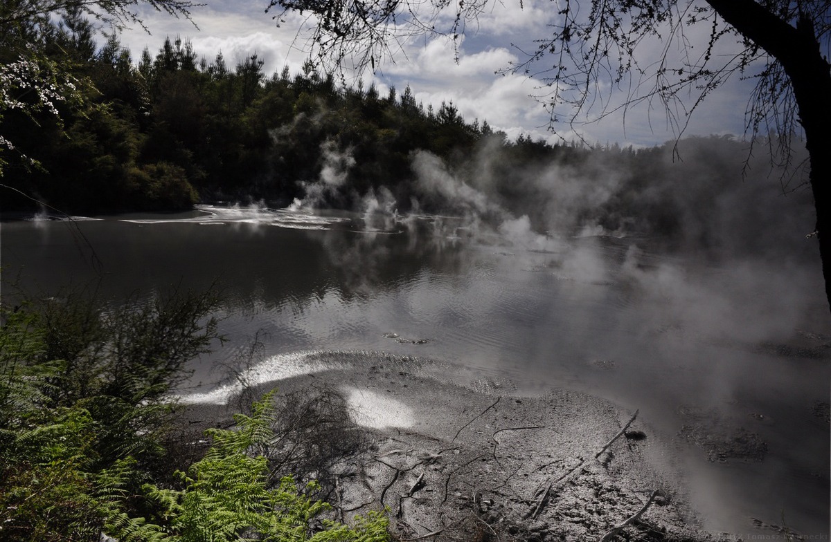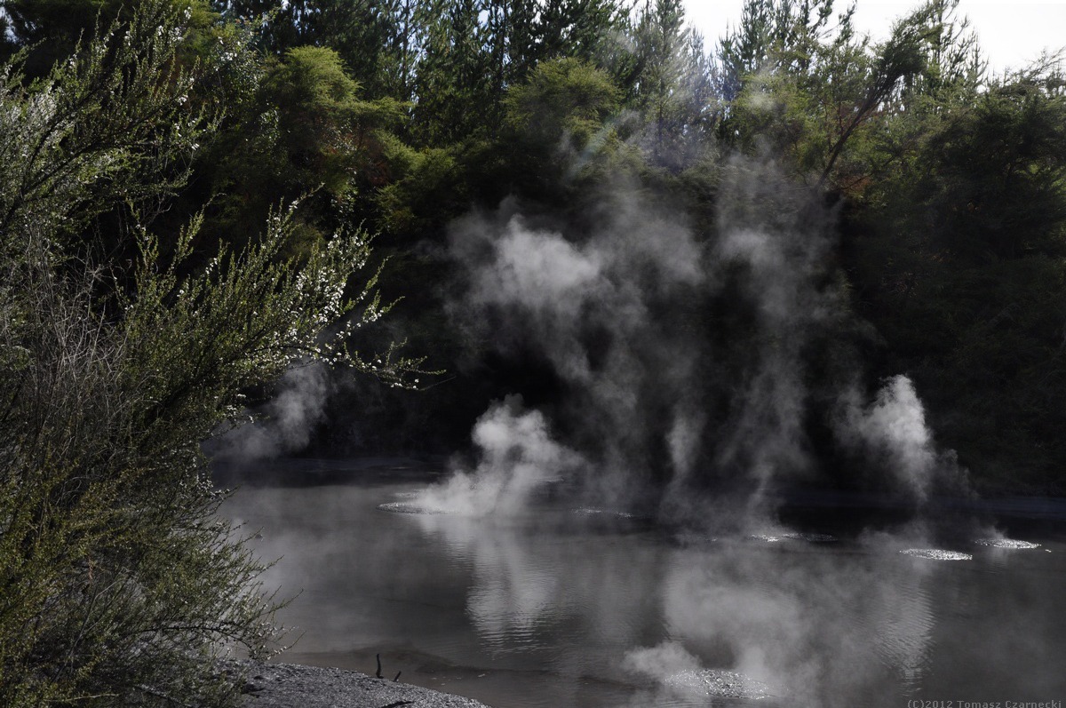 Dzień zaczynamy od wizyty przy bulgocącyh jeziorach błotnych w Wai-o-tapu (maori – święte wody). Nad wodą unoszą się opary o ostrym zapachu siarkowodoru, jezioro bulgoce i co chwila wurzuca nad powierzchnię rozrywające się błotniste bąble. W większości bąble te są niewielkie jednak w kilku miejscach trwa większa aktywność, bąble wylatują na wyskokść ponad metra i rozrywając się ochlapują szarym błotem otoczenie. Jezioro jest pełne dżwięków, zapachów – zdaje się żyć i oddychać.