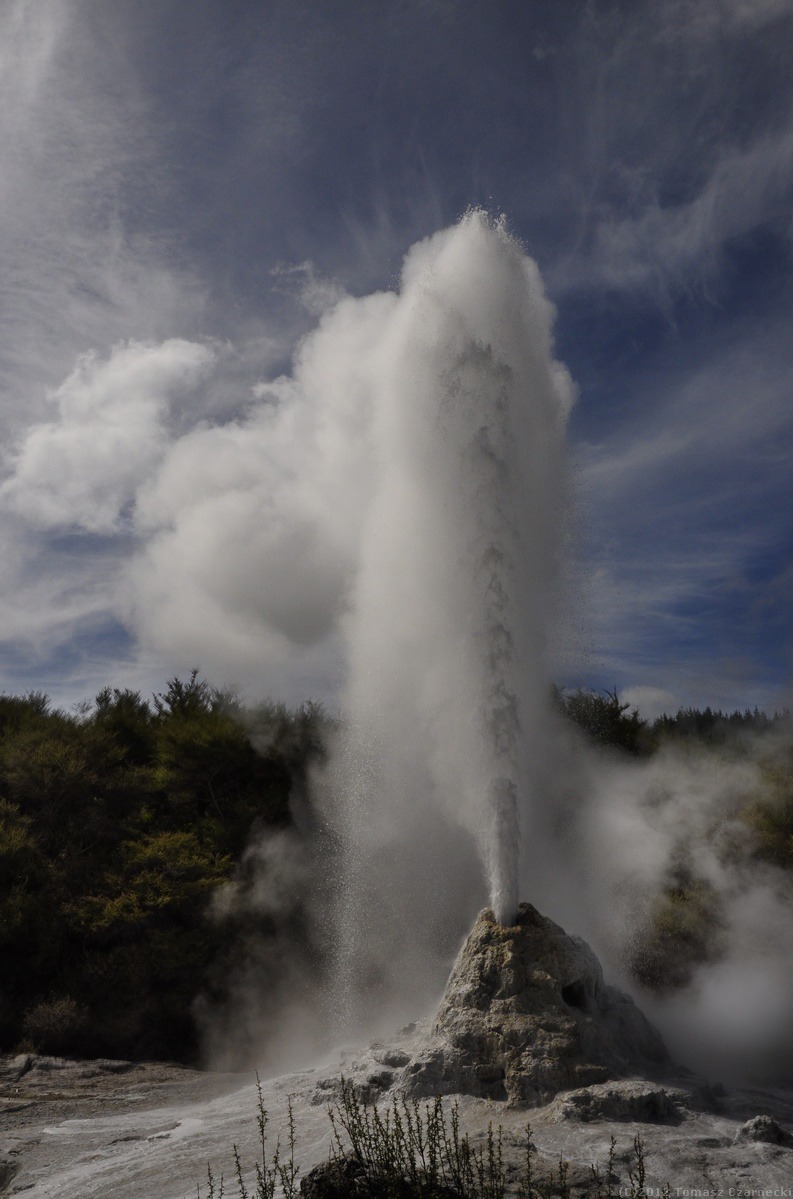 Podjeżdżamy pod centrum dla odwiedzajacych, żeby sprawdzić, o której wybucha największy gejzer w okolicy – Lady Knox – i ile kosztuje wejście. Okazuje się, że eksplozje mają miejsce codziennie o 10:15 czyli za mniej niż 45 minut. Kupujemy bilety i podjeżdżamy na parking przy gejzerze. Powyżej gejzeru zbudowana jest widownia, zajmujemy srtategiczne miejsca uwzględniając kierunek wiatru i tło.