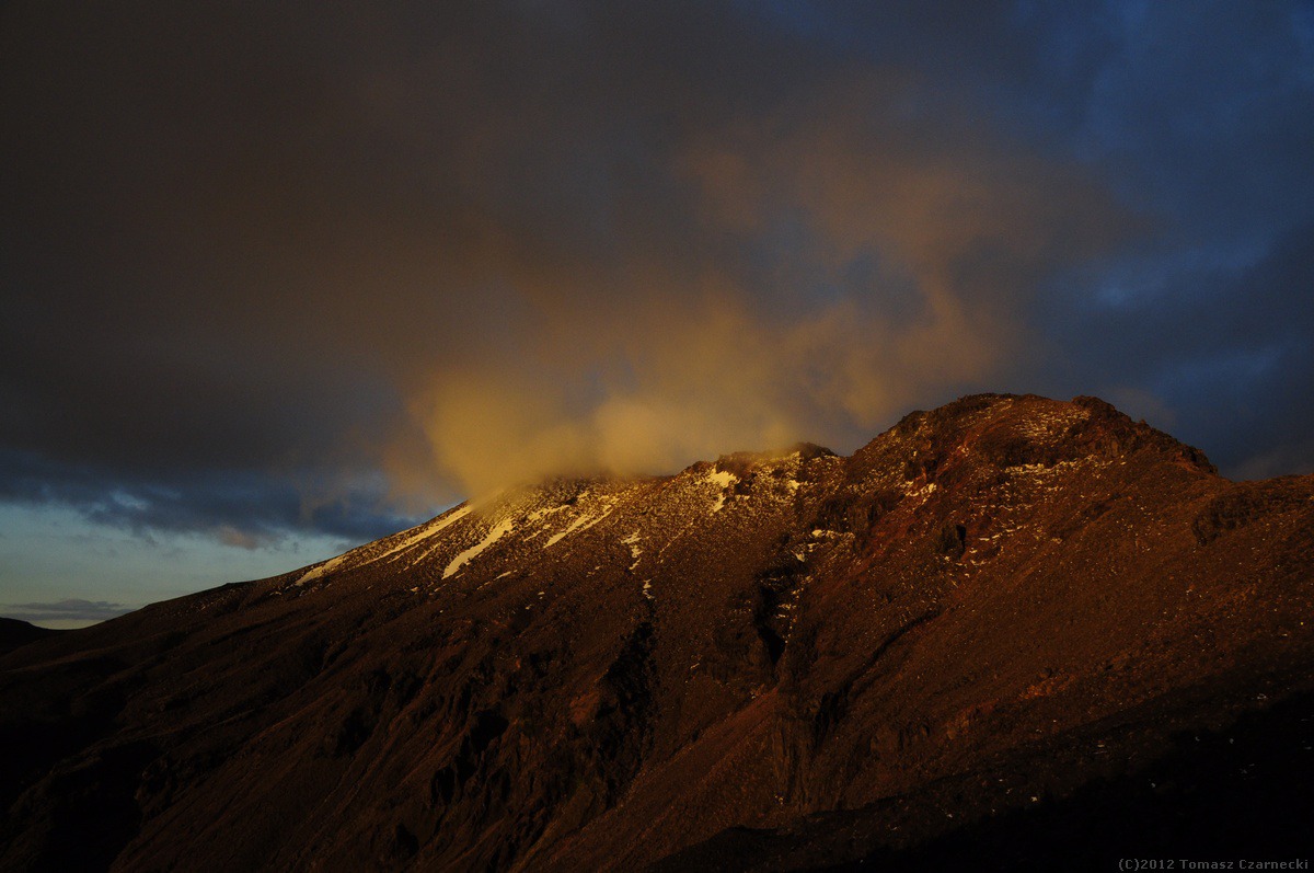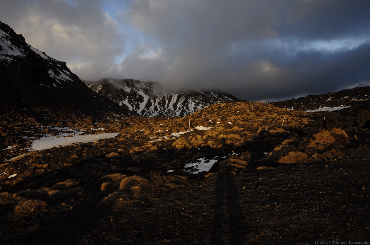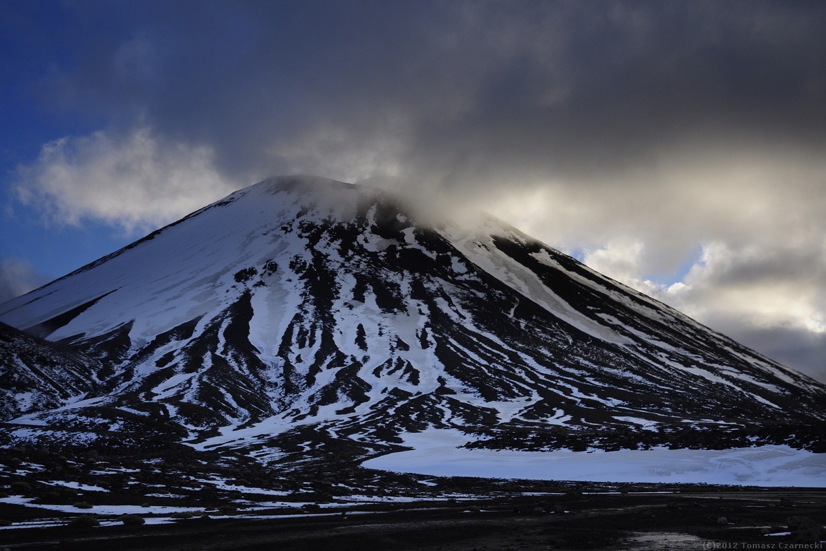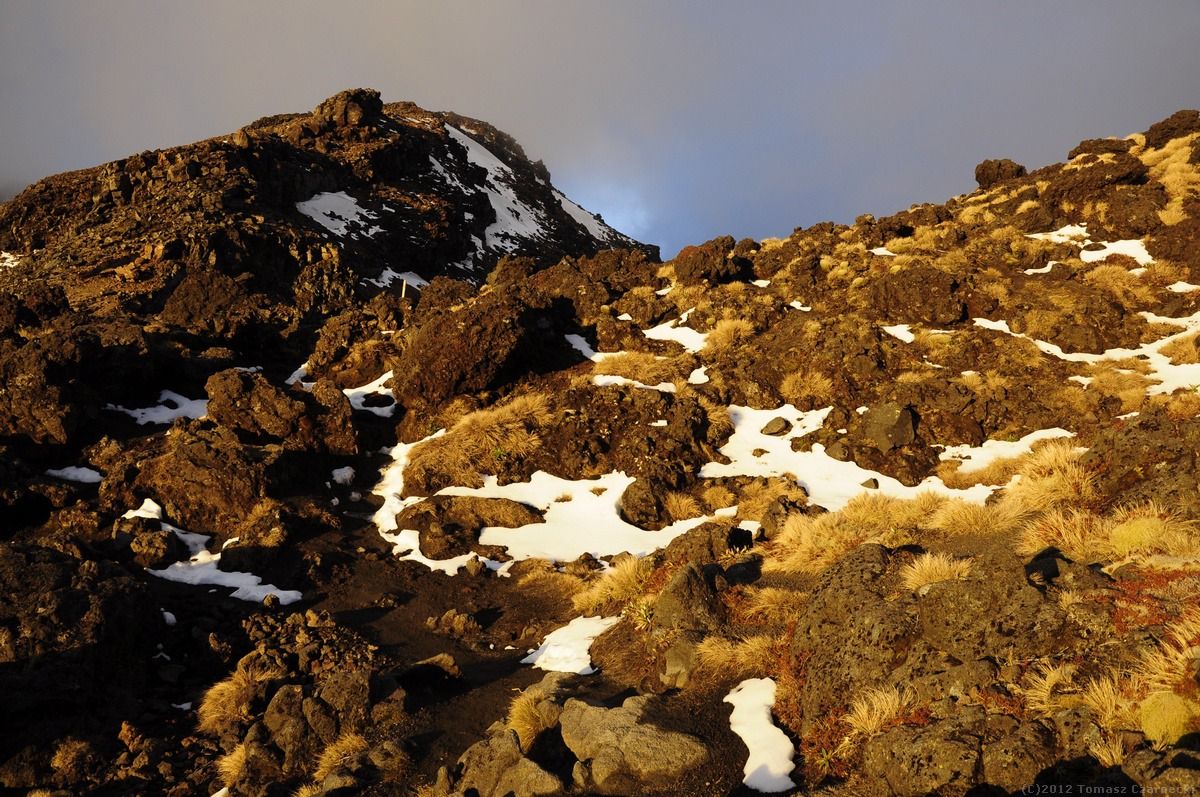 Podejście okazuje się mniej wyczerpujące niż wyglądało z centalnego krateru. A widok, który otwiera się za grzbietem ponownie zapiera ponownie dech w piersiach. Południowy krater wypełniają pasma śniegu, na prawo wznosi się główny szczyt Tongariro, a przed nami regularny, wulkaniczny stożek Ngauruhoe – najmłodzego wulkanu masywu. Wulkan ten w 20. wieku wybuchał 45 razy. We Władcy Pierścieni Petera Jacksona to właśnie ten stożek wcielił się w rolę Orodruiny (Góry Przeznaczenia), a spływy piroklastyczne na zachodnich stokach, którymi wiedzie w dół szlak odegrały rolę pól Mordoru. Gdy wchodzimy do tej martwej krainy zachodzące Słońce czerwonym światłem oświetla oba wulkany.