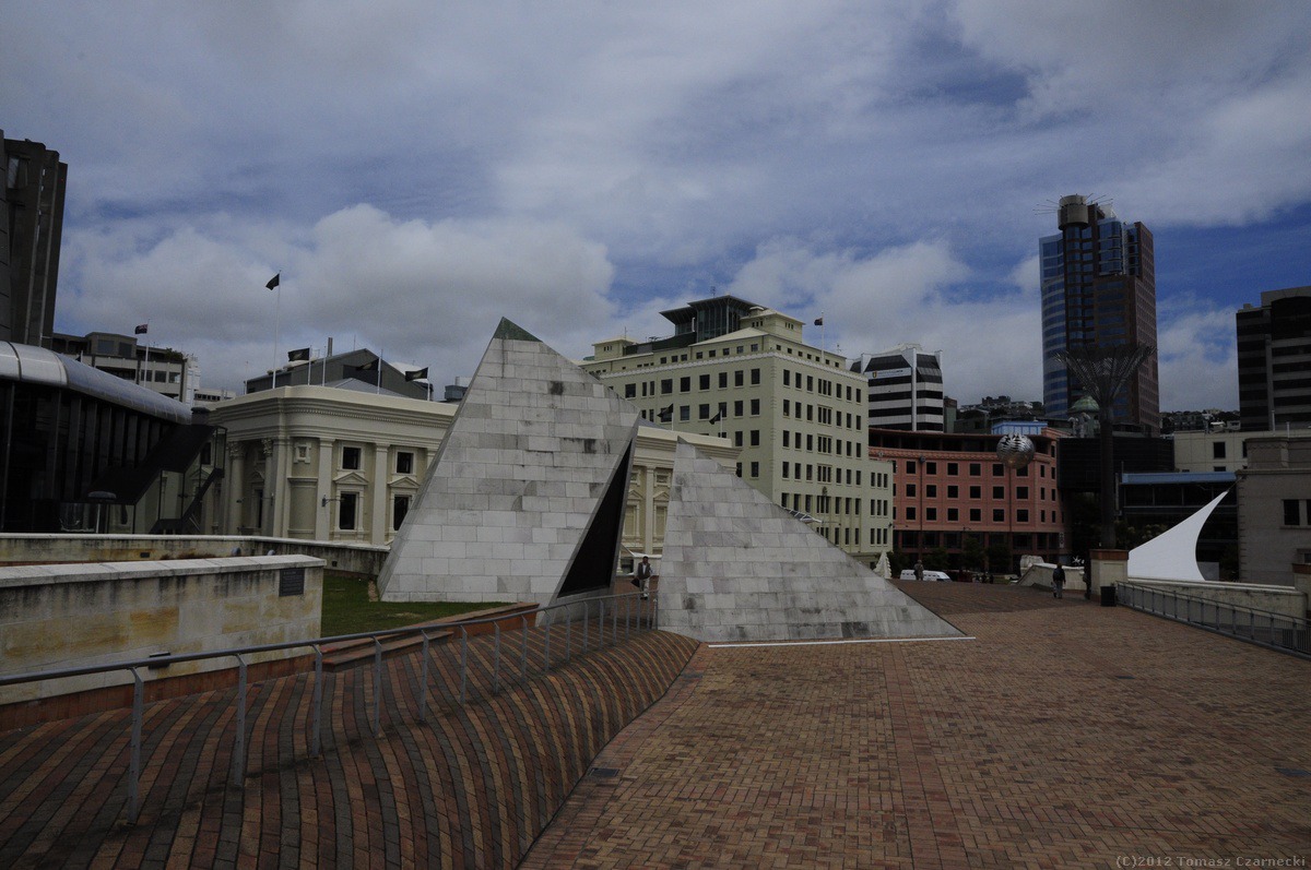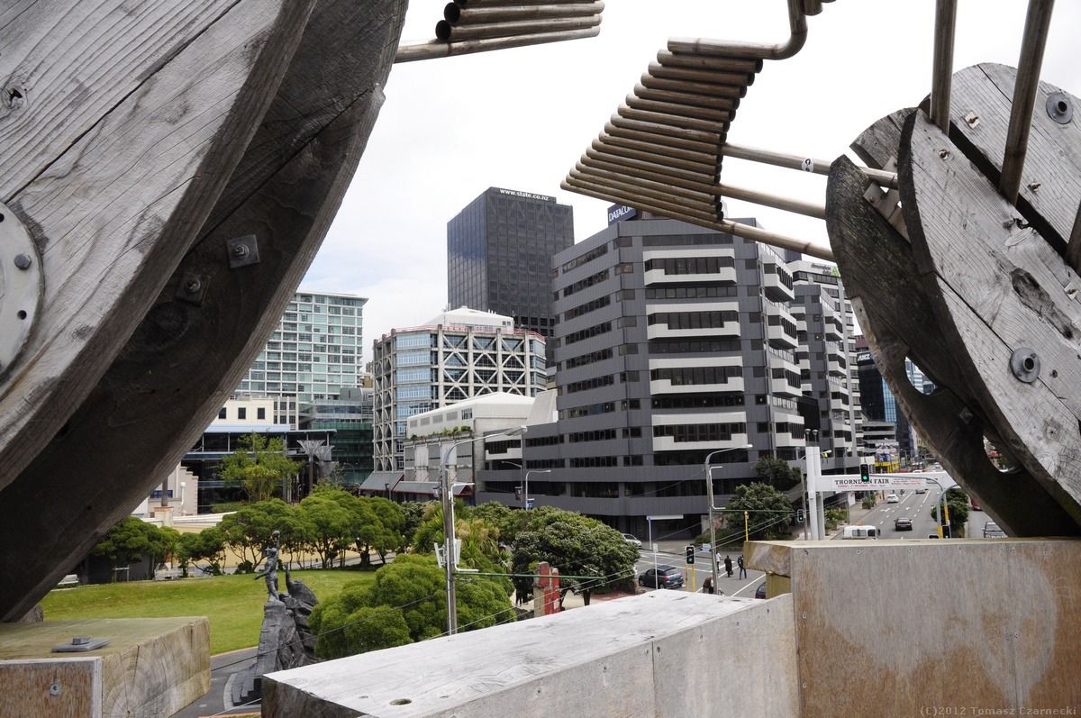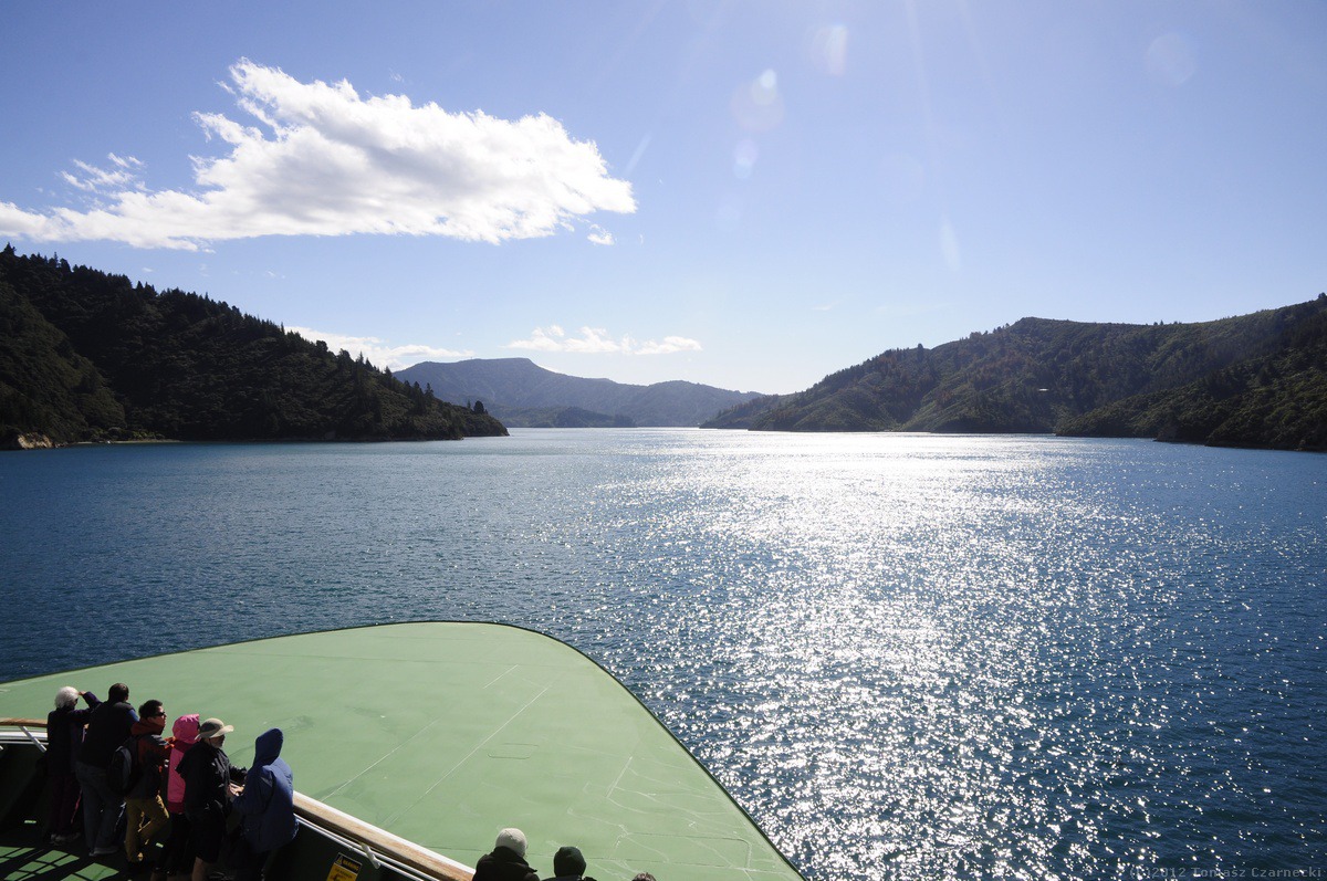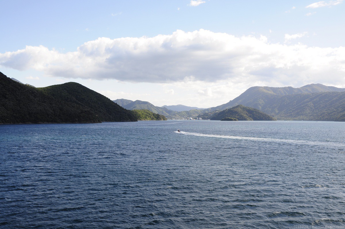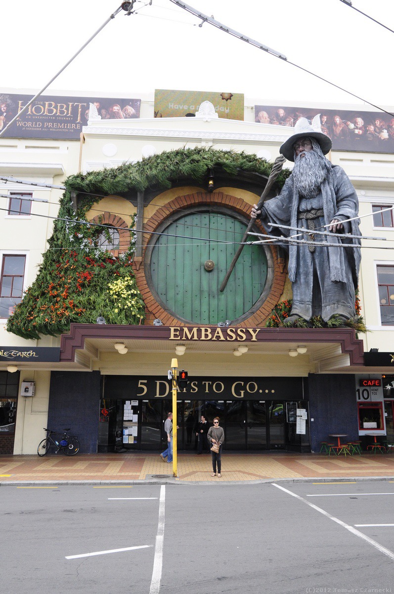 Zrywamy się przed świtem. Do Wellington, stolicy Śródziemia… eee… Nowej Zelandii mamy pięć godzin jazdy, a o 14:30 wypływa prom Interislander Aartere. To najlepsza pora na przepłynięcie nie tylko cieśniny Cooka ale przede wszystkim fiordów Marlborough Sound i Queen Charlotte Sound oraz łączącego je przesmyku Tory Channel. A jeszcze chcemy mieć parę godzin na zobaczenie stolicy Śródziemia na pięć dni przed premierą Hobbita. Co godzinę zmieniamy się z Jerzym za kierownicą i do Wellington dociermay koło 11-ej, na poczcie kupujemy okolicznościowe znaczki i koperty wydane z okazji faktu, że Wellington za kilka dni na miesiąc oficjalnie zmieni nazwę na stolicę Śródziemia. Wszędzie wiszą bannery przypominające postaci z Hobbita J.R.R. Tolkiena. Nad wejściem do kina, w którym za pięć dni odbędzie się premiera góruje olbrzymia postać Gandalfa. Wellington to bogate architektonicznie miasto, z pięknym portem, muzeami, sklepikami. Wędrujemy z Elą i Kasią wokół portu, zatrzymujemy się w Visitor Center, gdzie kupuję pamiątkową, hobbicką koszulkę z Gandalfem.