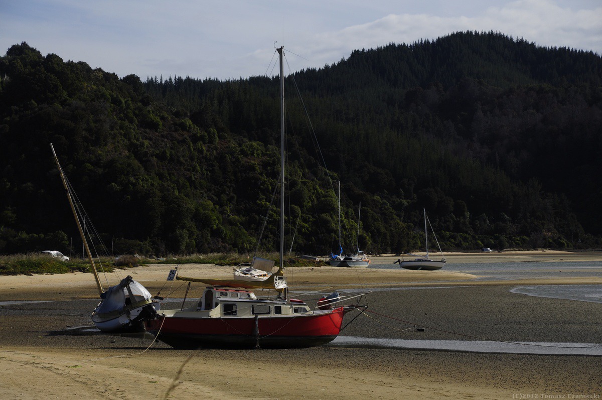 Doliną wśród zielonych wzgórz jedziemy na zachód Richmond. W drodze zatrzymuje nas na chwilę przedziwny widok – płot obwieszony setkami par butów. Hmm… Od Nelson przez Richmond aż po Motueka droga okrąża rozległą zatokę Tasmana. Jest odpływ więc morze jest daleko od brzegu. Czasem gdzieś stoi na wysuszonym, spękanym odkrytym dnie stoi jakaś łódka. W centrum dla odwiedzających Park Narodowy Abel Tasman w Motueka dowiadujemy się gdzie jeszcze zdążymy dzisiaj dotrzeć.