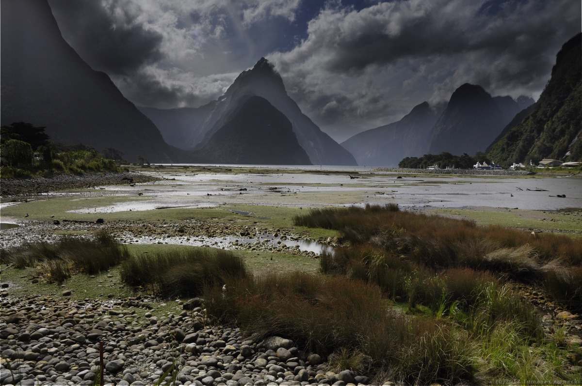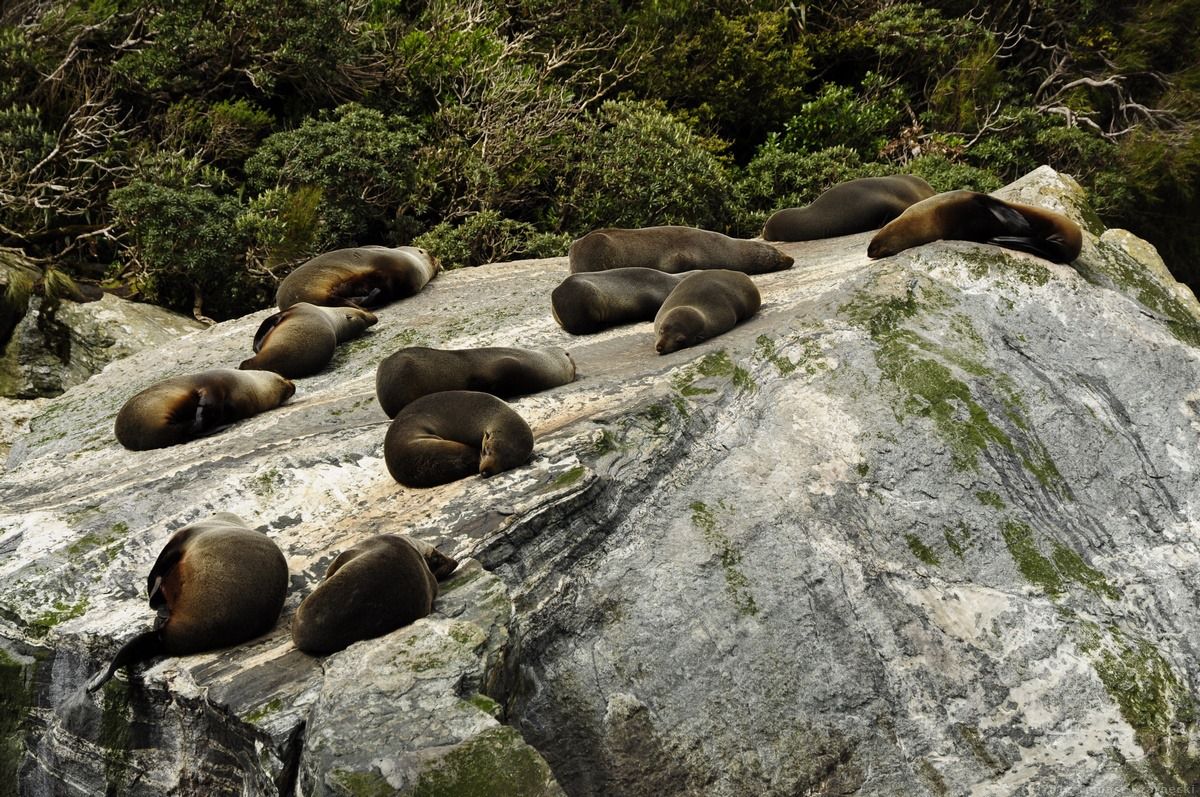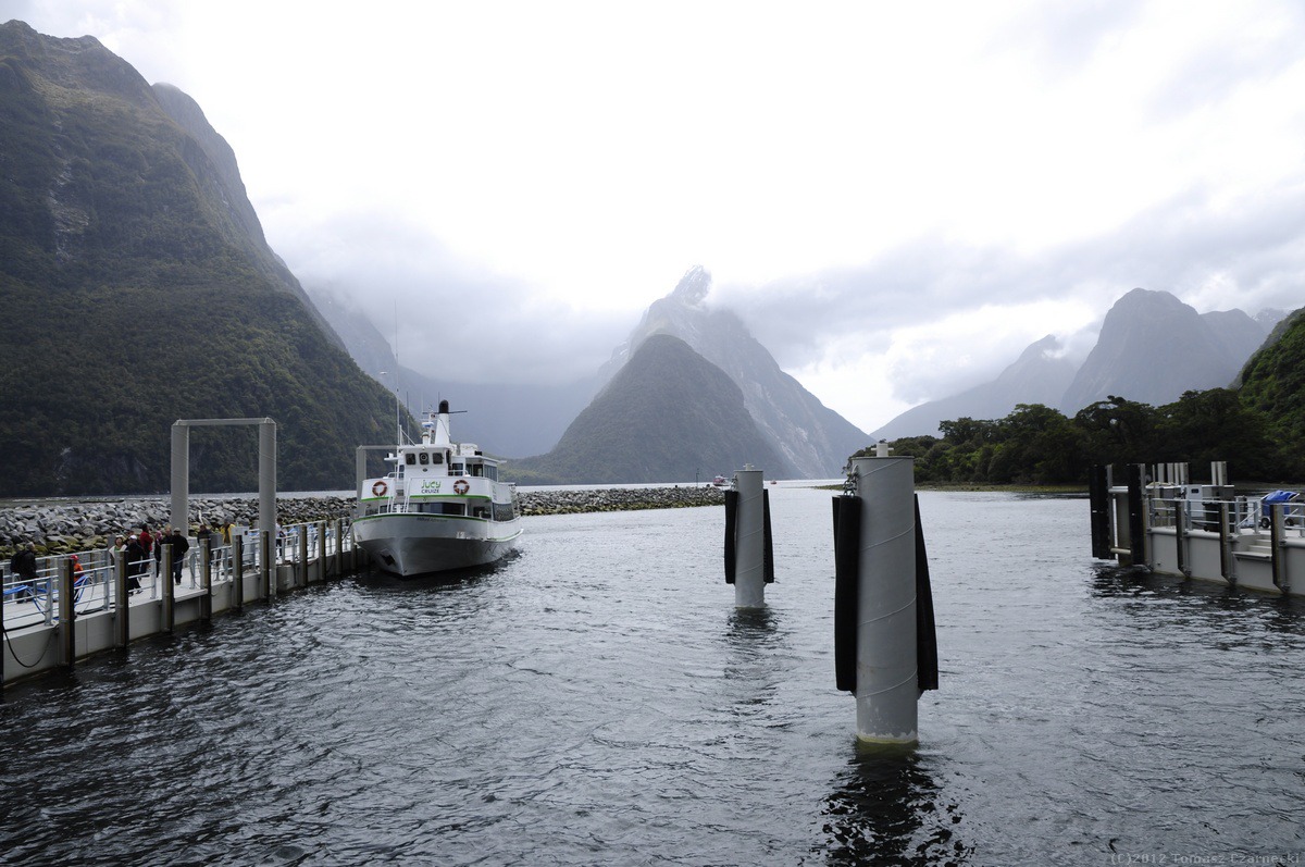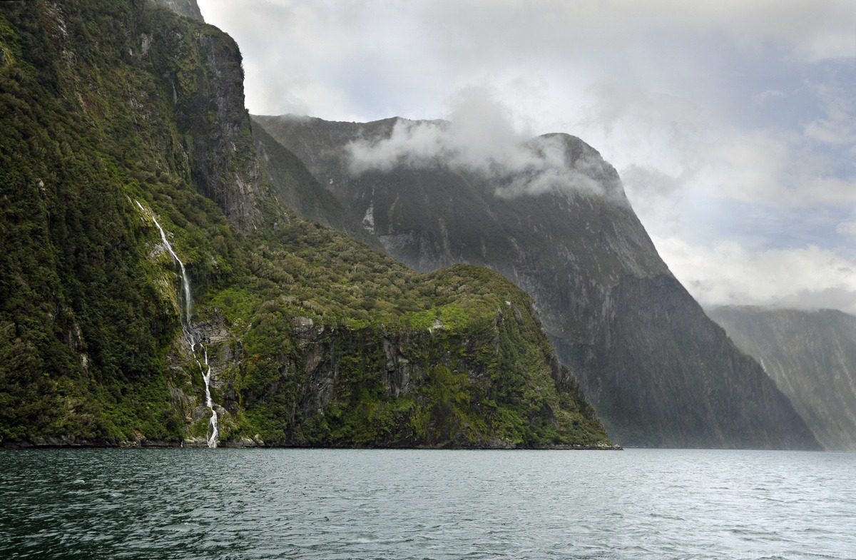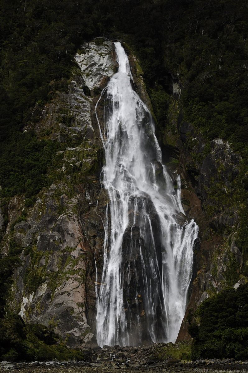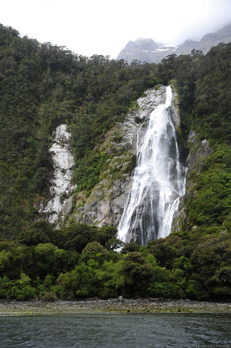 Ruszamy z Te Anau na jedną z najpiękniejszych dróg świata – Millford Road – prowadzącą do fiordu Millford Sound. Początkowo droga prowadzi wzdłuż brzegu jeziora Te Anau, a potem wbija się w Alpy Południowe Parku Narodowego Fiordland podążając wzdłuż rzeki Eglinton River. Zatrzymujemy się przy lustrzanych jeziorach, w których odbijają się górskie szczyty. Góry w tej okolicy zagrały rolę Gór Mglistych we Władcy Pierścieni. Dalej fotografujemy kaskady na strumieniu Cascades Creek. Tu niestety dopada mnie wenecka klątwa i razem z aparatem ląduję pod wodą. Na szczęście w odróżnieniu od Wenecji woda tutaj nie jest słona, więc do wieczora mój aparat odżyje. Na razie jednak działa… albo nie działa… dziwnie. A ja mogę przeżywać otoczenie, wysokie górskie ściany z wąskimi kaskadami wodospadów opadających w dół doliny Hollyford. Docieramy do skalnej ściany, przez którą do doliny Cleddau przebito mający 1270 metrów tunel Homera. Za tunelem serpentynami droga opada aż do portu, z którego wycieczkowe statki wypływają na wycieczki po fiordzie Milford Sound. Wybieramy stateczek wycieczkowy i po chwili oczekiwania wypływamy na piękny rejs. Wraz z Pawłem zajmujemy miejsca na dziobie statku. Fale czasami rozbijają się o dziób i przelewają opryskując nas wodą. Oprócz nas na dziobie są jeszcze dwie turystki – blondynka i śliczna czarnoskóra kanadyjka. Mijamy wysoki na 162 metrów wodospad Lady Bowens. W fiordzie zawiesozne są niskie chmury, wieje dość silny wiatr. Ze stromych ścian fiordu spadają wąskie wodospady. Podobno po silnych opadach deszczu, a te zdarzają się tu dość często, ze skalnych ścian może spadać 6000 wodospadów. Statek wypływa na morze Tasmana, zawraca. Na skałach widać kolonie fok. Podpływamy do jednej z nich. Potem statek praktycznie wpływa w wysoki na 155 metrów wodospad Stirling. W przestrzeni fiordu trudno ocenić odległości i wysokości. Jedyne co wskazuje na wysokość wodospadu to wrażenie, że woda spada w zwolnionym tempie. Na dziobie zostaję ja. Dołącza do mnie Jerzy. Lodowato zimna woda spadająca z krawędzi 155 metrów nad nami smaga… w końcu udaje jej się dostać pod kurtkę i polar. Ale film udaje się nagrać.
