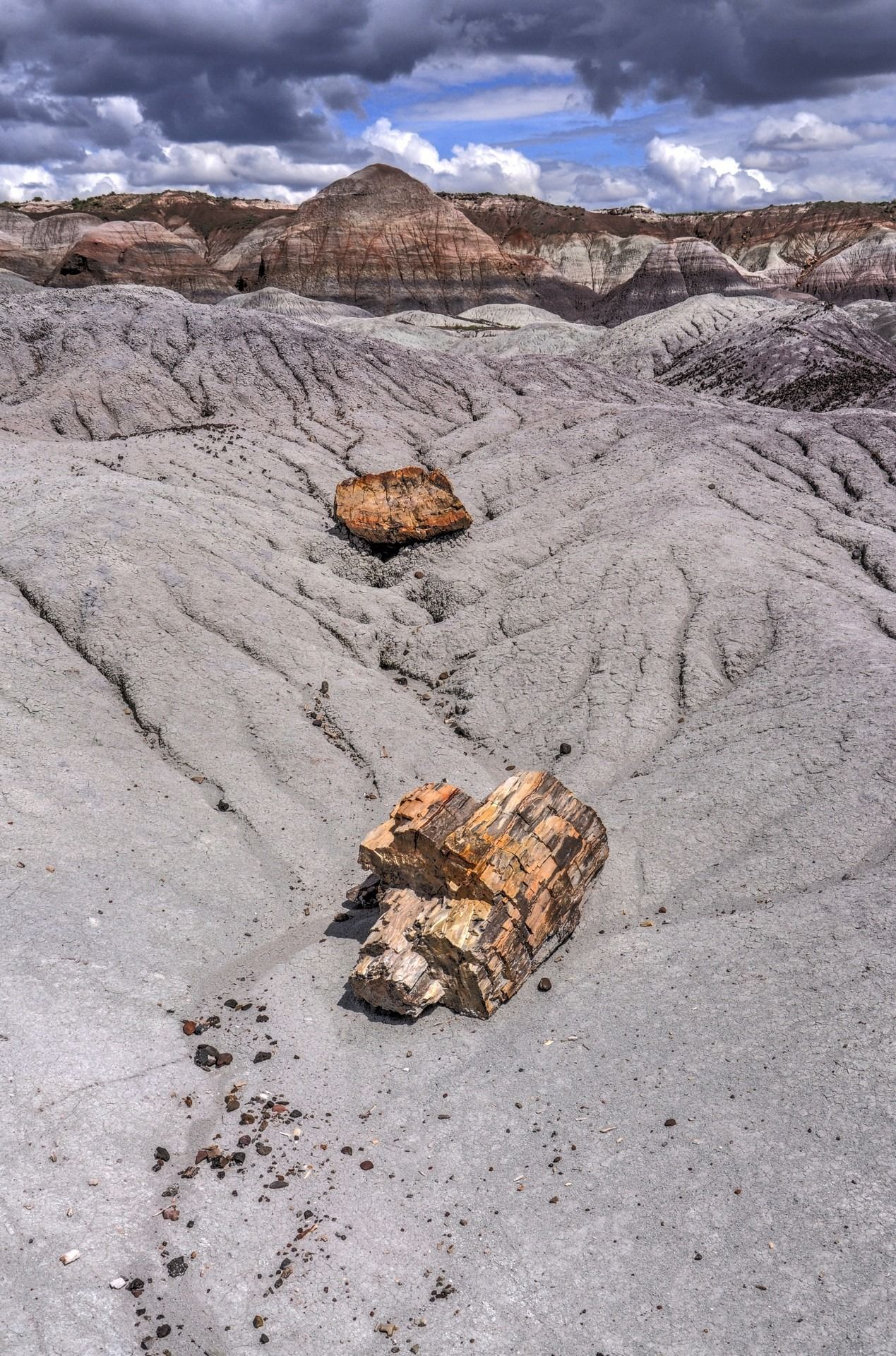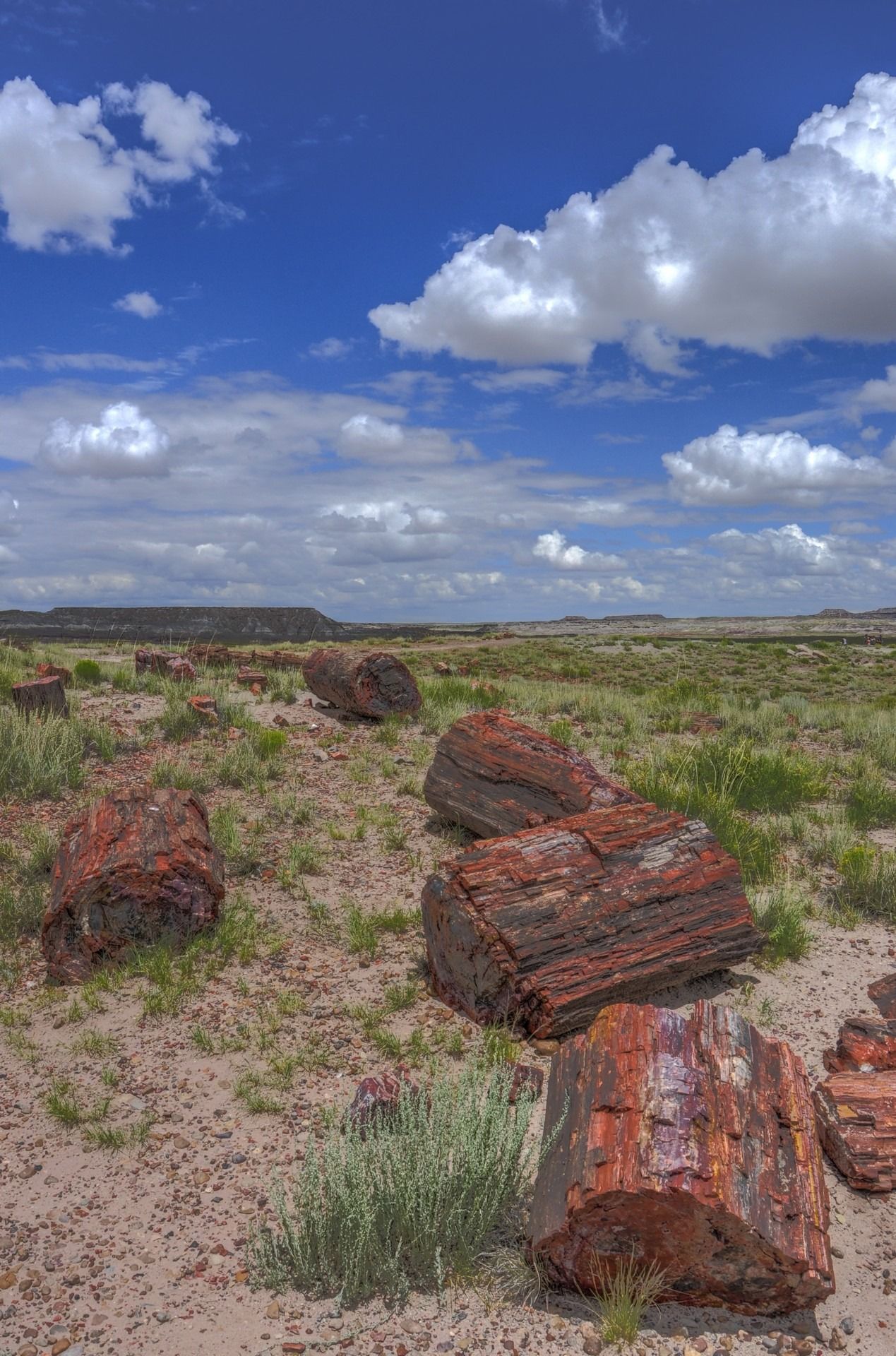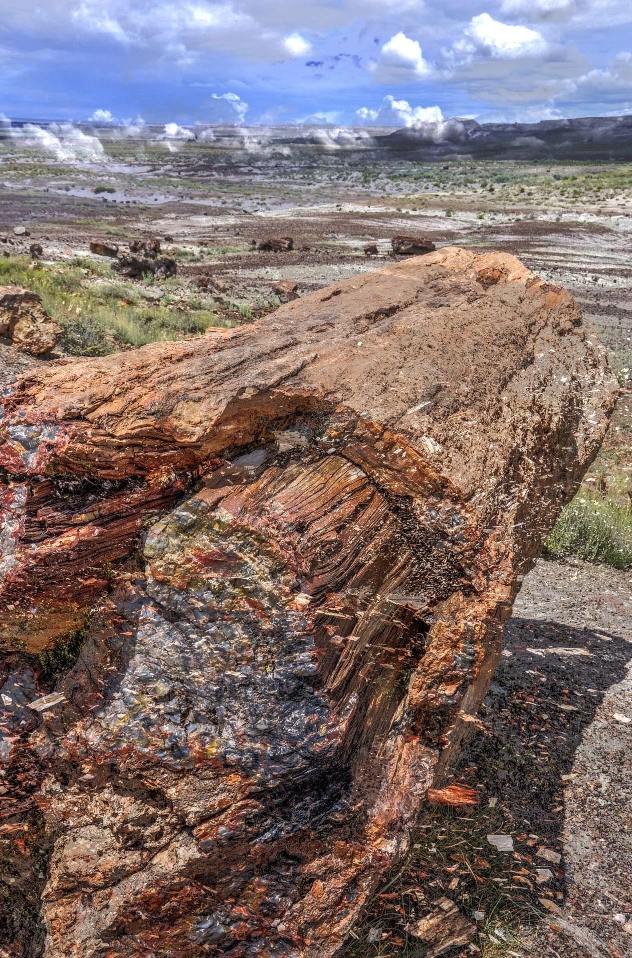 Last (but not least) we reach Petrified Forest National Park, which has been named for its large deposits of petrified wood. PPark covers about 600 sq km, encompassing semi-desert shrub steppe as well as highly eroded and colorful badlands. The Petrified Forest is known for its fossils, especially fallen trees that lived in the Late Triassic, about 225 million years ago. The sediments containing the fossilized logs are part of the widespread and colorful Chinle Formation, from which the Painted Desert gets its name. Beginning about 60 million years ago, the Colorado Plateau, of which the park is part, was pushed upwards by tectonic forces and exposed to increased erosion. All of the park’s rock layers above the Chinle, except geologically recent ones found in parts of the park, have been removed by wind and water. In addition to petrified logs, fossils found in the park have included Late Triassic ferns, cycads, ginkgoes, and many other plants as well as fauna including giant reptiles called phytosaurs, large amphibians, and early dinosaurs. Paleontologists have been unearthing and studying the park’s fossils since the early 20th century.