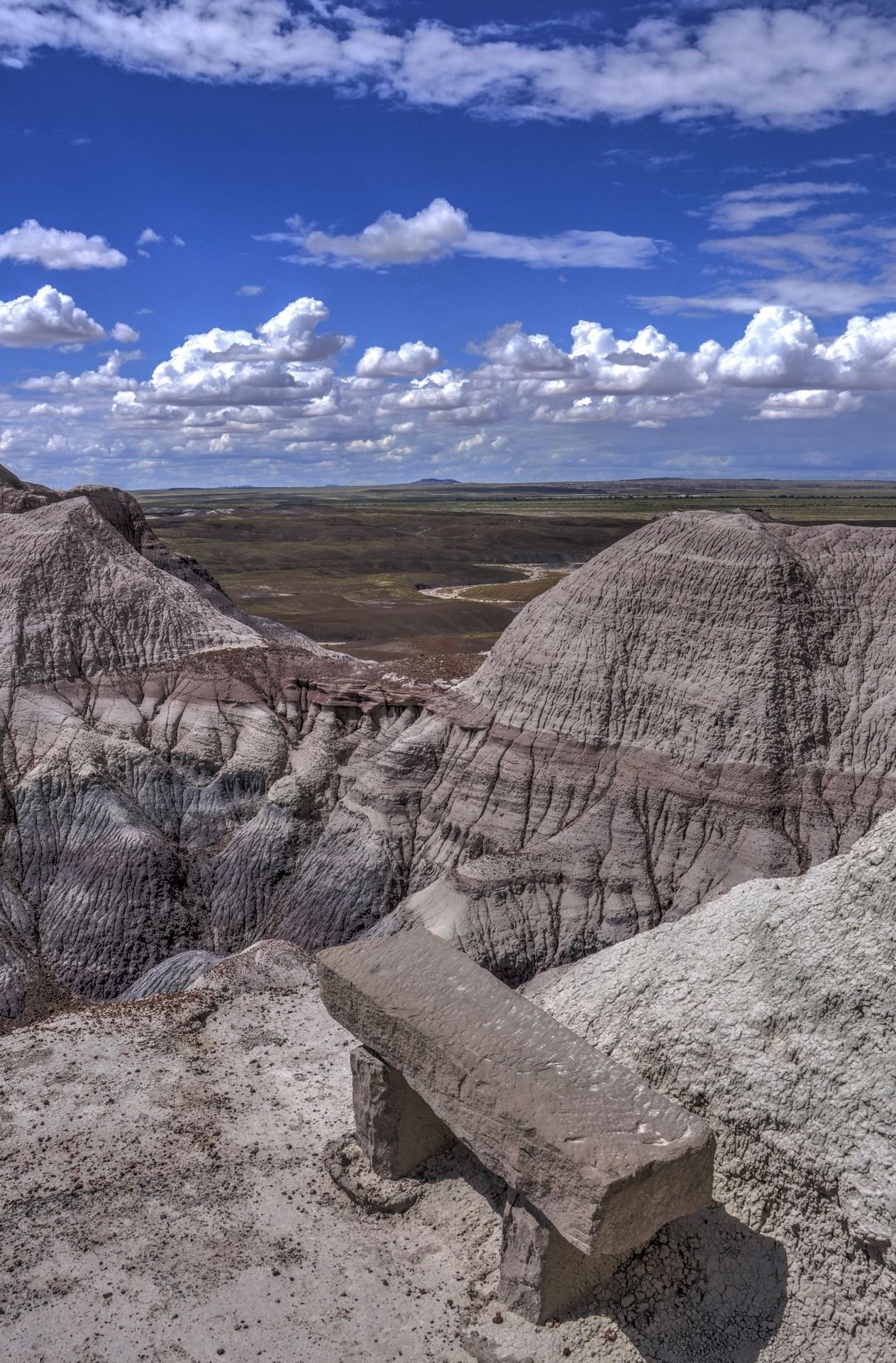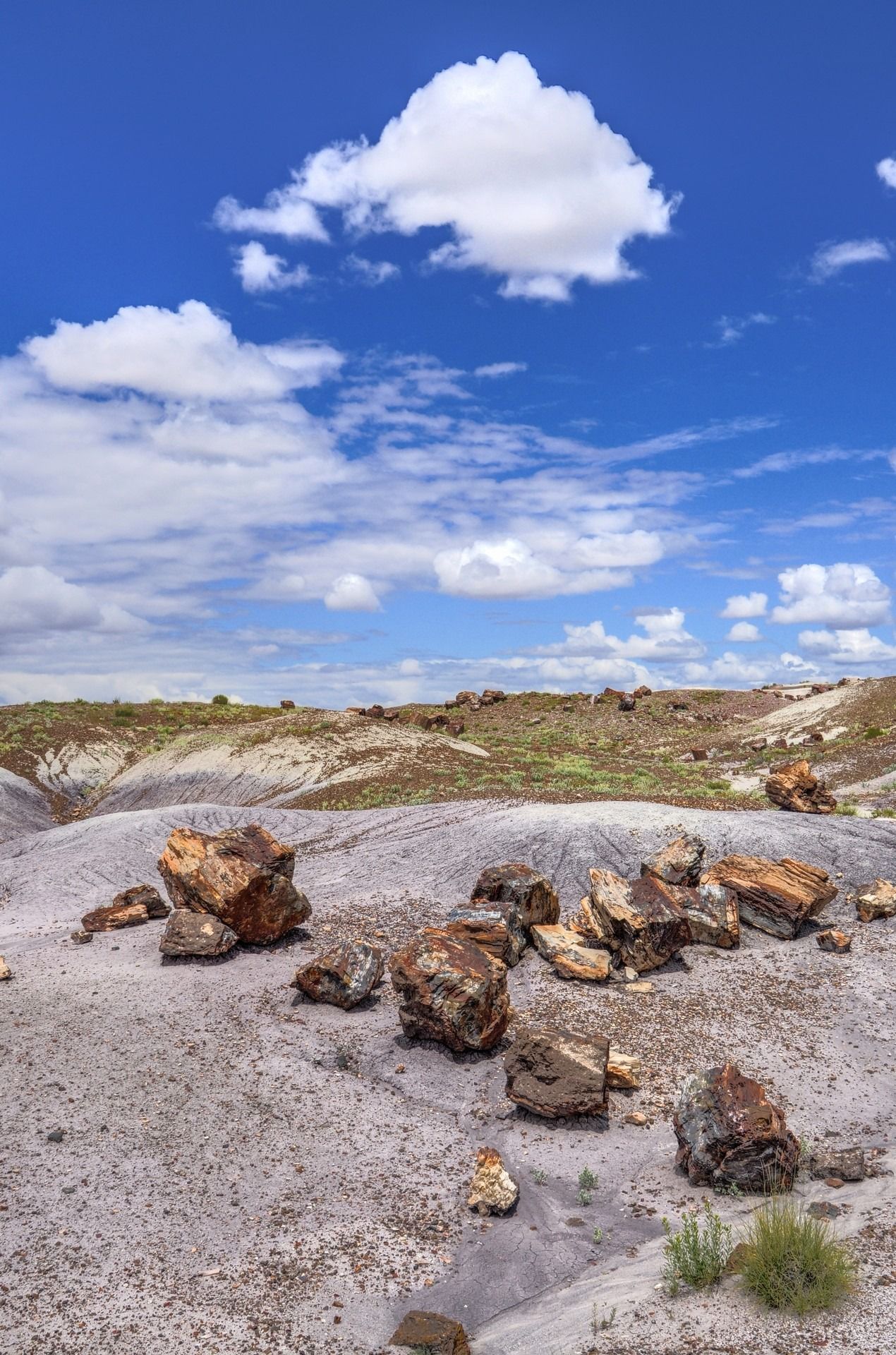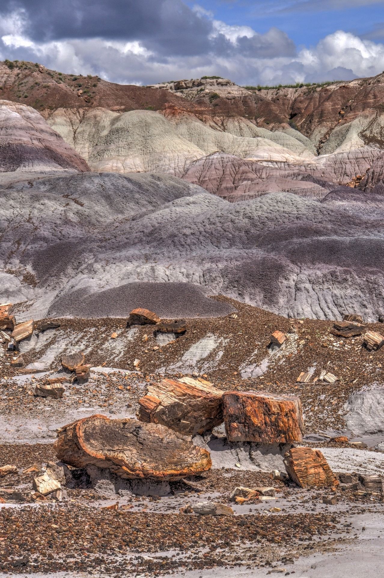 Last (but not least) we reach Petrified Forest National Park, which has been named for its large deposits of petrified wood. PPark covers about 600 sq km, encompassing semi-desert shrub steppe as well as highly eroded and colorful badlands. The Petrified Forest is known for its fossils, especially fallen trees that lived in the Late Triassic, about 225 million years ago. The sediments containing the fossilized logs are part of the widespread and colorful Chinle Formation, from which the Painted Desert gets its name. Beginning about 60 million years ago, the Colorado Plateau, of which the park is part, was pushed upwards by tectonic forces and exposed to increased erosion. All of the park’s rock layers above the Chinle, except geologically recent ones found in parts of the park, have been removed by wind and water. In addition to petrified logs, fossils found in the park have included Late Triassic ferns, cycads, ginkgoes, and many other plants as well as fauna including giant reptiles called phytosaurs, large amphibians, and early dinosaurs. Paleontologists have been unearthing and studying the park’s fossils since the early 20th century.