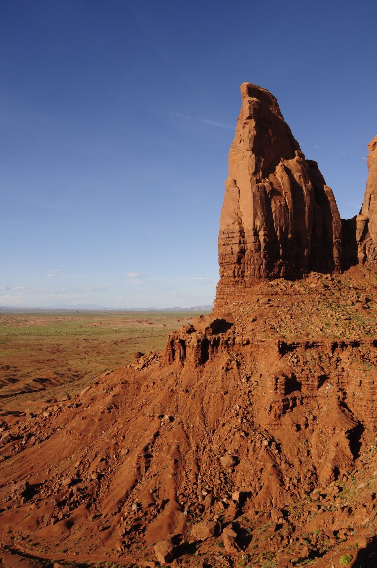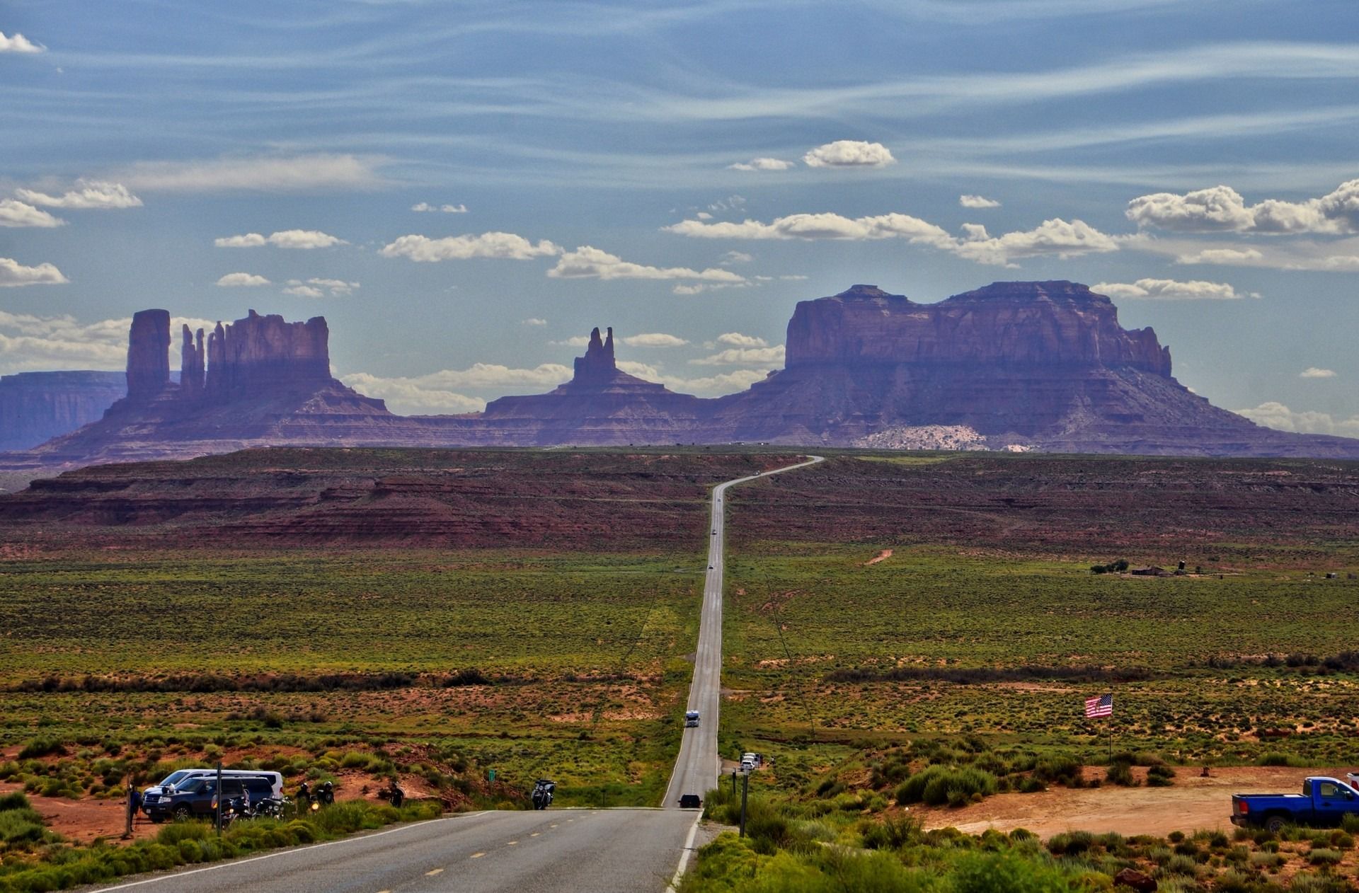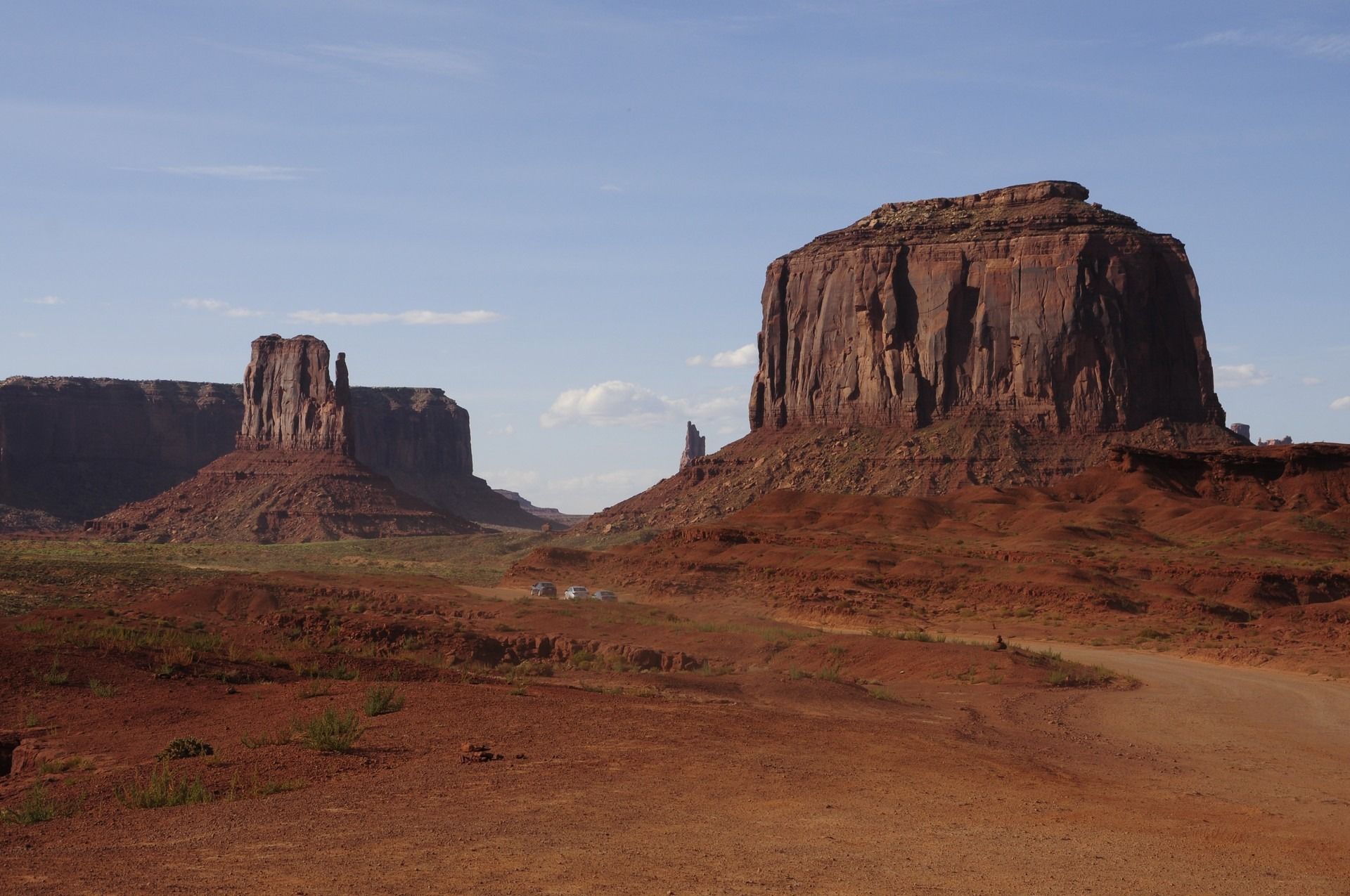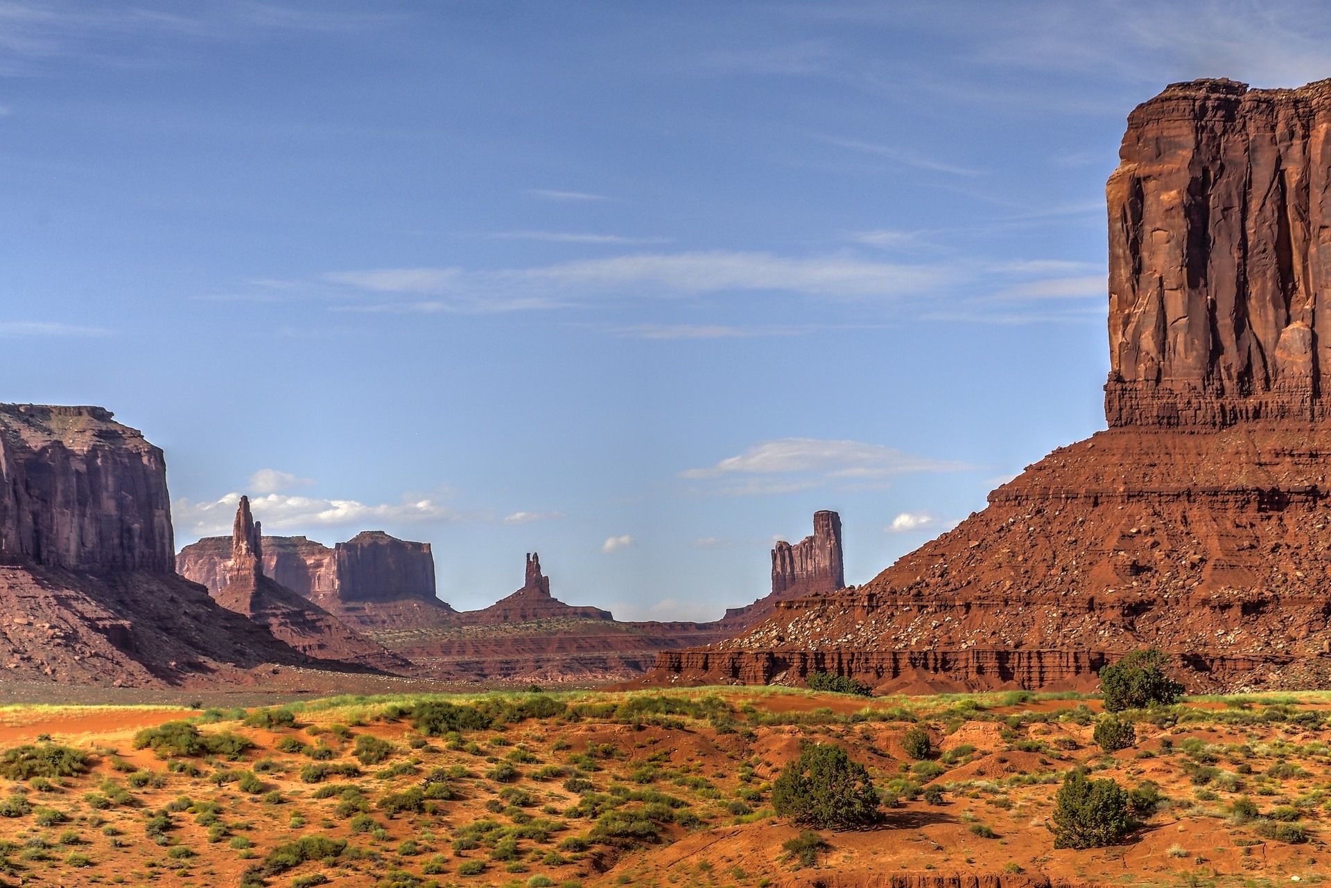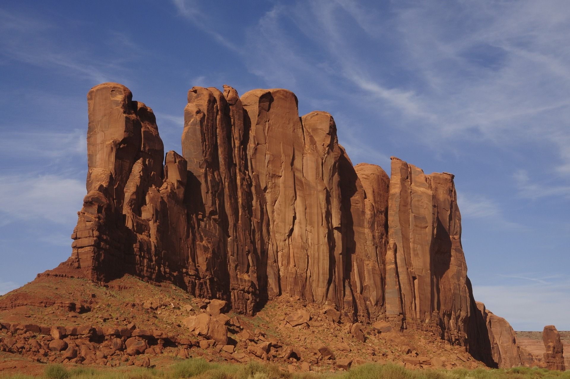 Tsé Biiʼ Ndzisgaii – “valley of the rocks”, known by most as Monument Valley Navajo Tribal Park is a region of the Colorado Plateau characterized by a cluster of vast sandstone buttes, the largest rising over 300 m above the valley floor, at the Arizona–Utah border. The valley lies within the territory of the Navajo Nation Reservation. Director John Ford used the location for a number of his best-known films and thus, in the words of critic Keith Phipps, “its five square miles have defined what decades of moviegoers think of when they imagine the American West.” The valley floor is largely siltstone of the Cutler Group, or sand derived from it, deposited by the meandering rivers that carved the valley. The valley’s vivid red color comes from iron oxide exposed in the weathered siltstone. The darker, blue-gray rocks in the valley get their color from manganese oxide. The buttes are clearly stratified, with three principal layers. The lowest layer is the Organ Rock Shale, the middle is de Chelly Sandstone, and the top layer is the Moenkopi Formation capped by Shinarump Conglomerate.