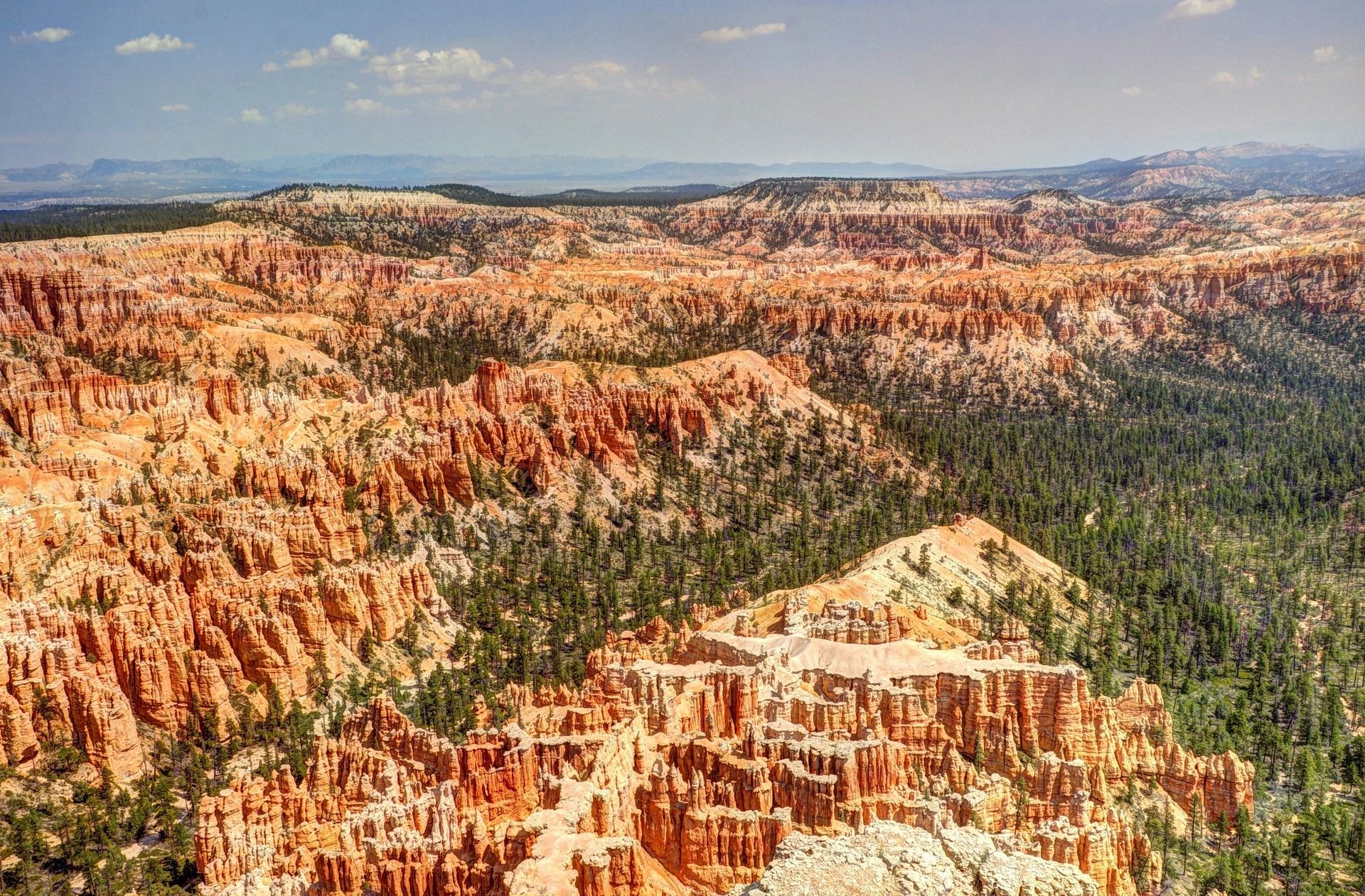 Bryce Canyon National Park protects Bryce Canyon in Utah. Despite its name, is not technically a canyon, but a collection of giant natural amphitheaters along the eastern side of the Paunsaugunt Plateau. Bryce is distinctive due to geological structures called hoodoos, formed by frost weathering and stream erosion of the river and lake bed sedimentary rocks. The red, orange, and white colors of the rocks provide spectacular views for park visitors. Delicate and colorful pinnacles stand up to 60 m tall. A series of amphitheaters extends more than 30 km along the rim. The largest of them is Bryce Amphitheater, which is 19 km long, 5 km wide and 240 m deep. Rainbow Point, the highest part of the park at 2,775 m is at the end of the 29 km scenic drive. From there, Aquarius Plateau, Bryce Amphitheater, the Henry Mountains, the Vermilion Cliffs and the White Cliffs can be seen.