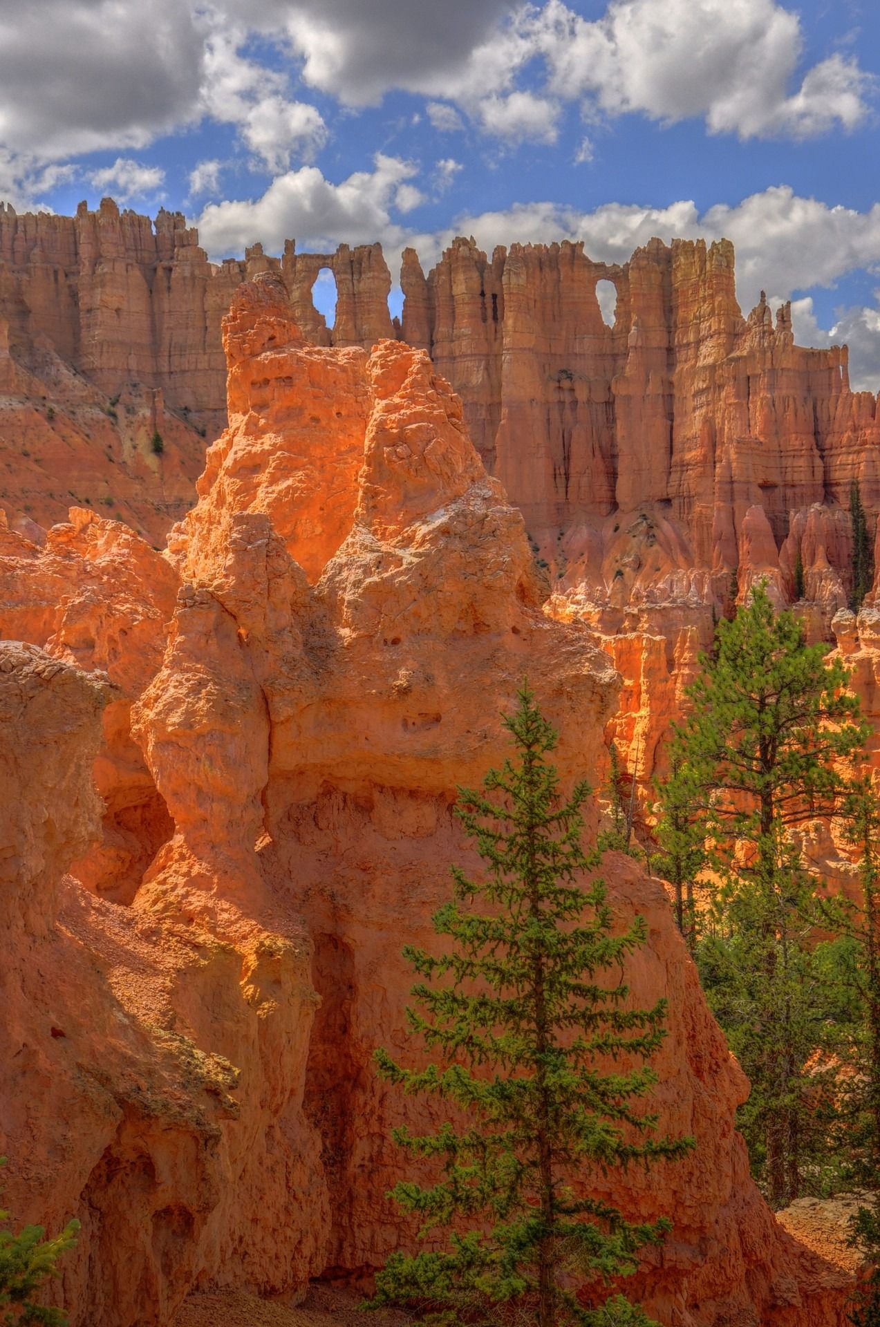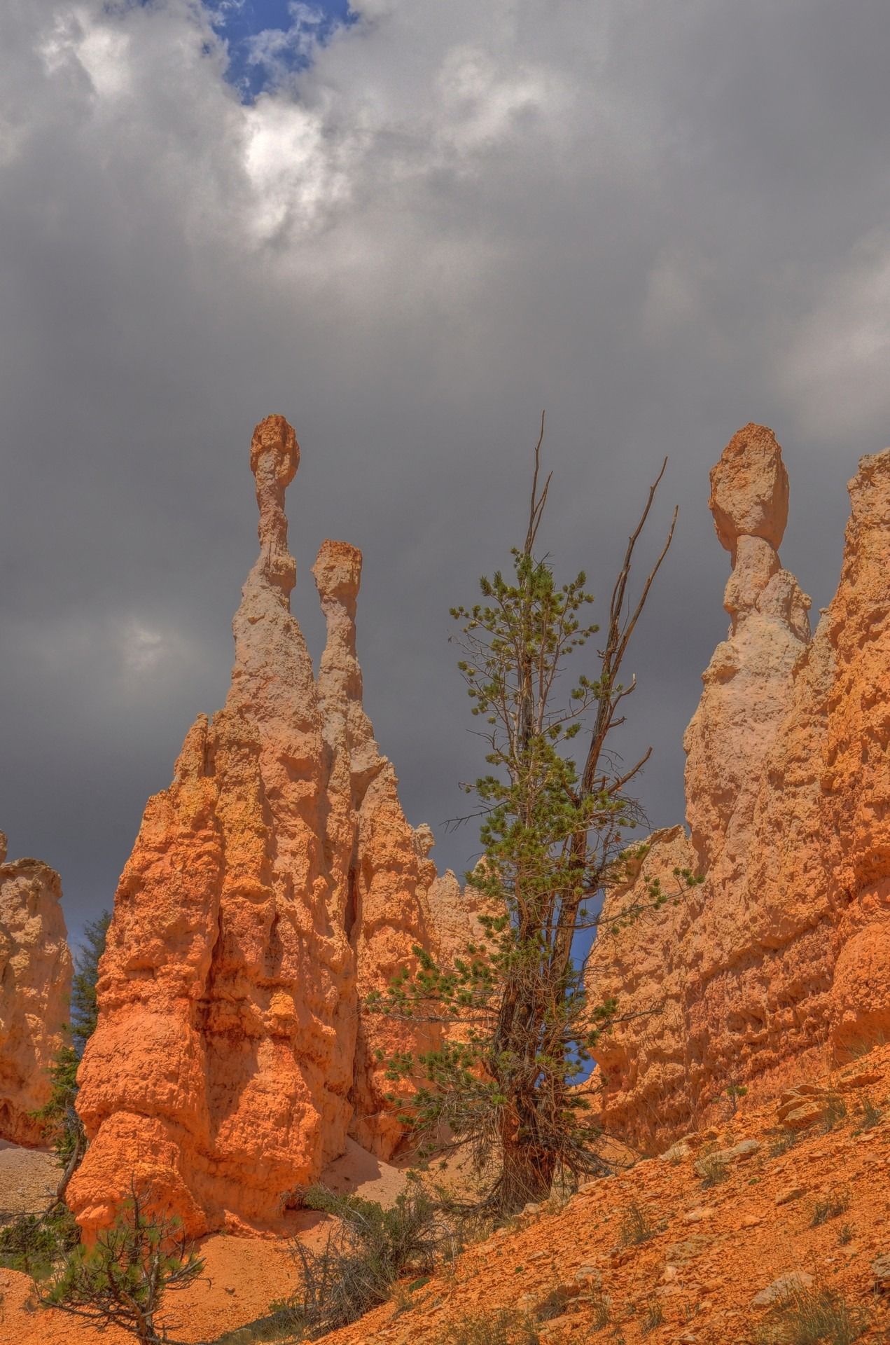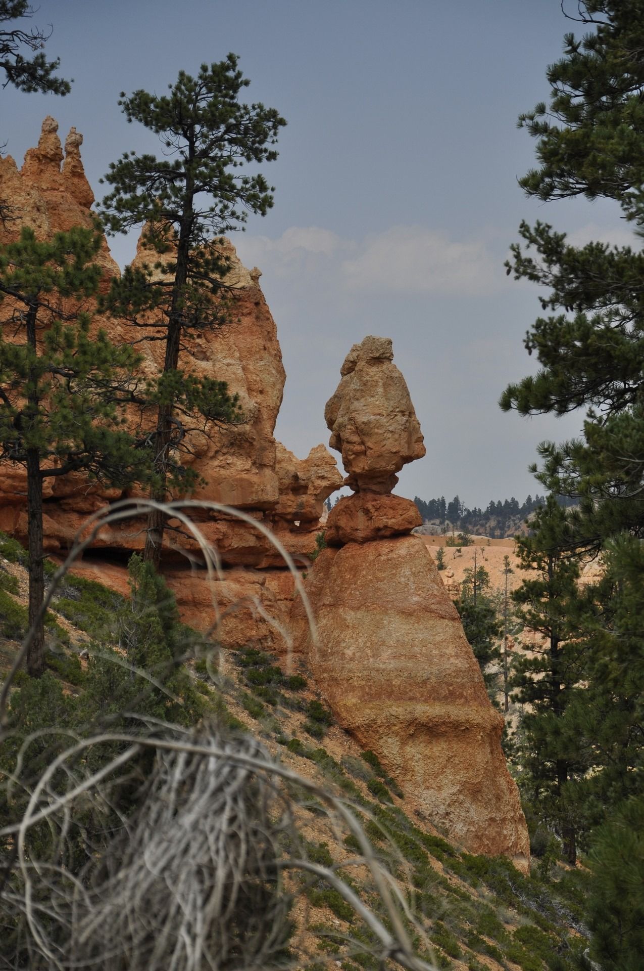 The most spectacular part of Bryce Canyon National Park, with the largest and densest formations, is thection between Sunrise Point and Bryce Point, centered on the upper drainage basin of Bryce Creek. The best trail down between those formation is probably the Peekaboo Trail, a hike of almost 9 km requiring almost 500 m descent from and then climb back to Bryce Point; as well as giving many amazing views of the main collections of hoodoos, both near and far, the path also crosses forested terrain where the more isolated formations contrast with the green and shady surroundings.