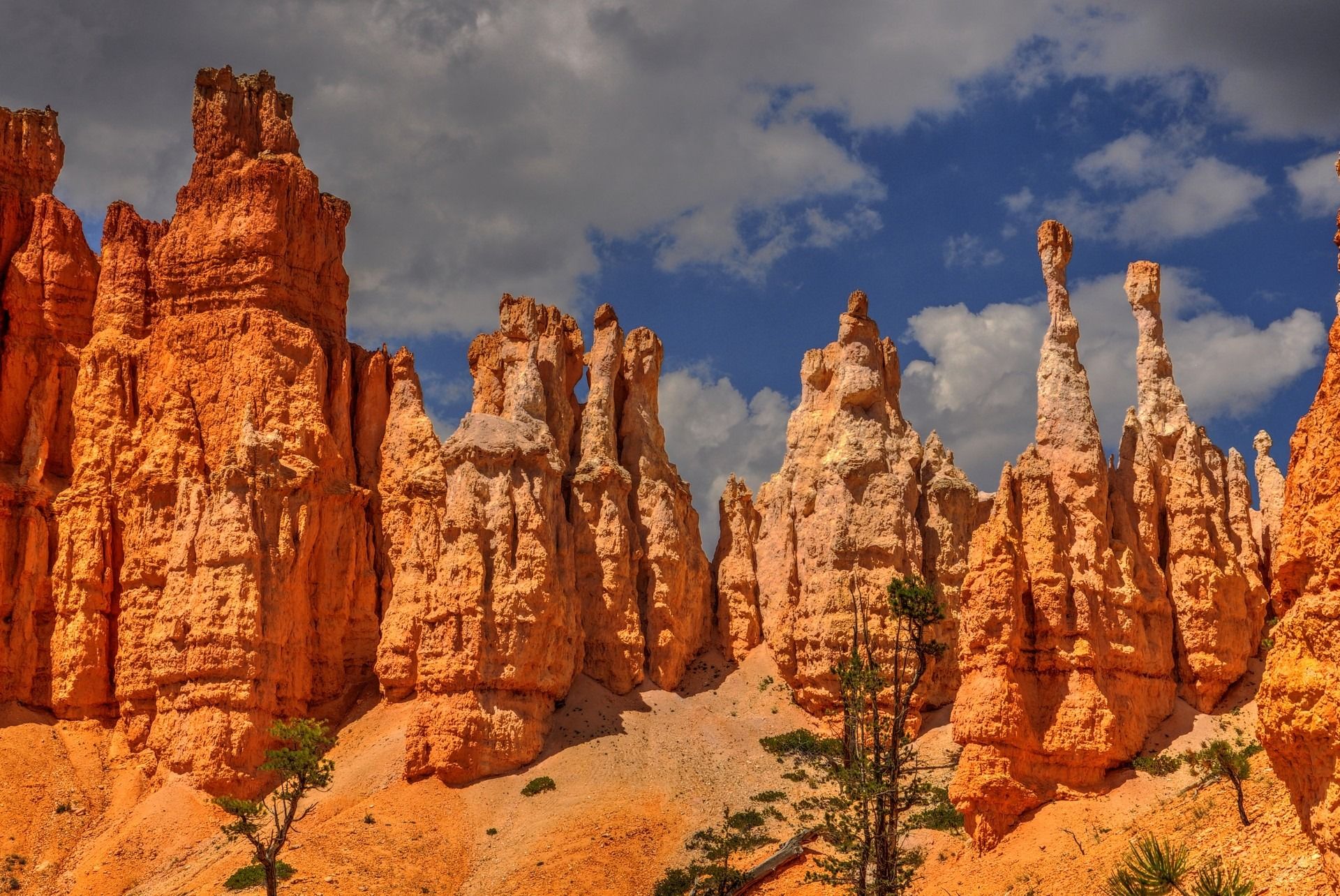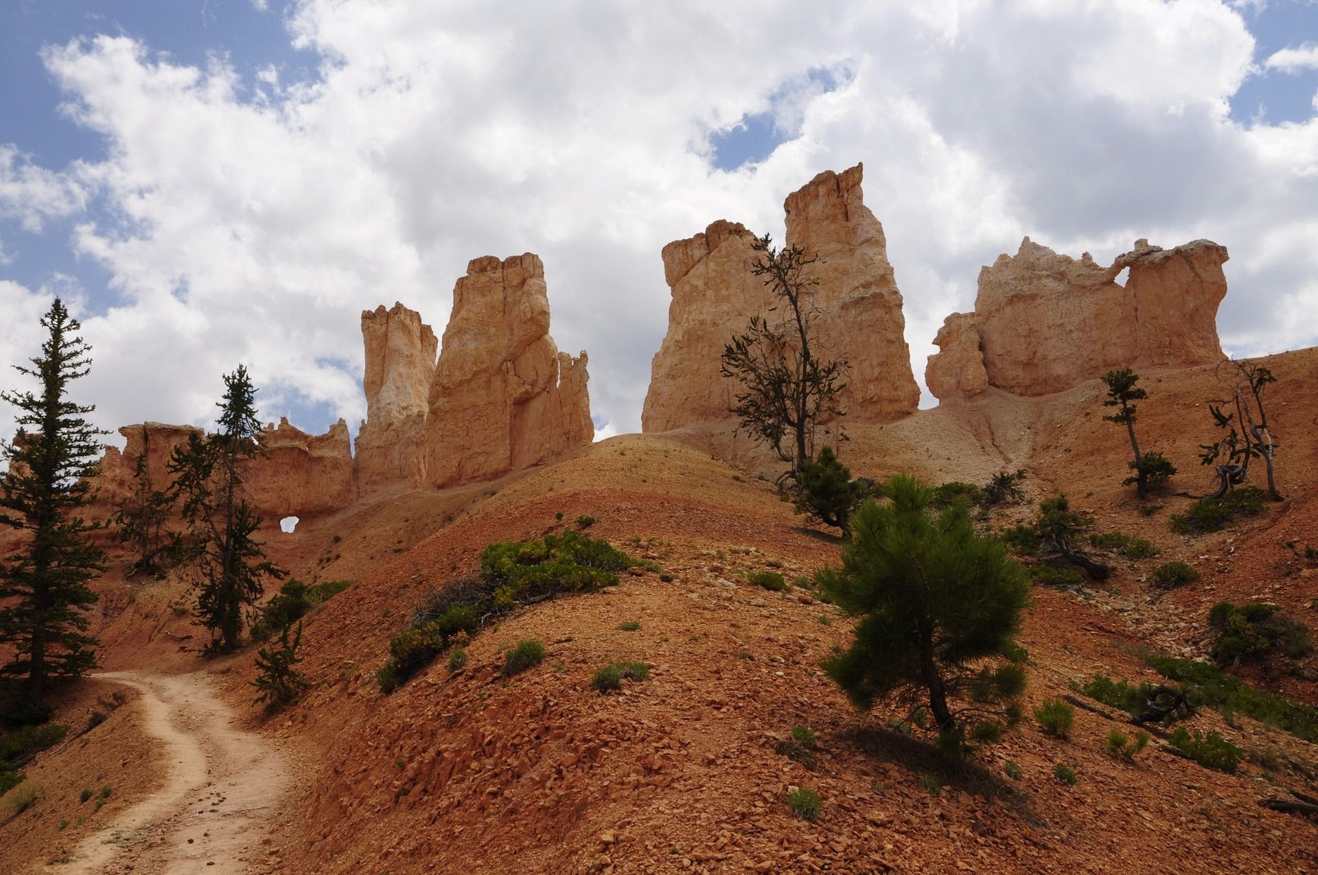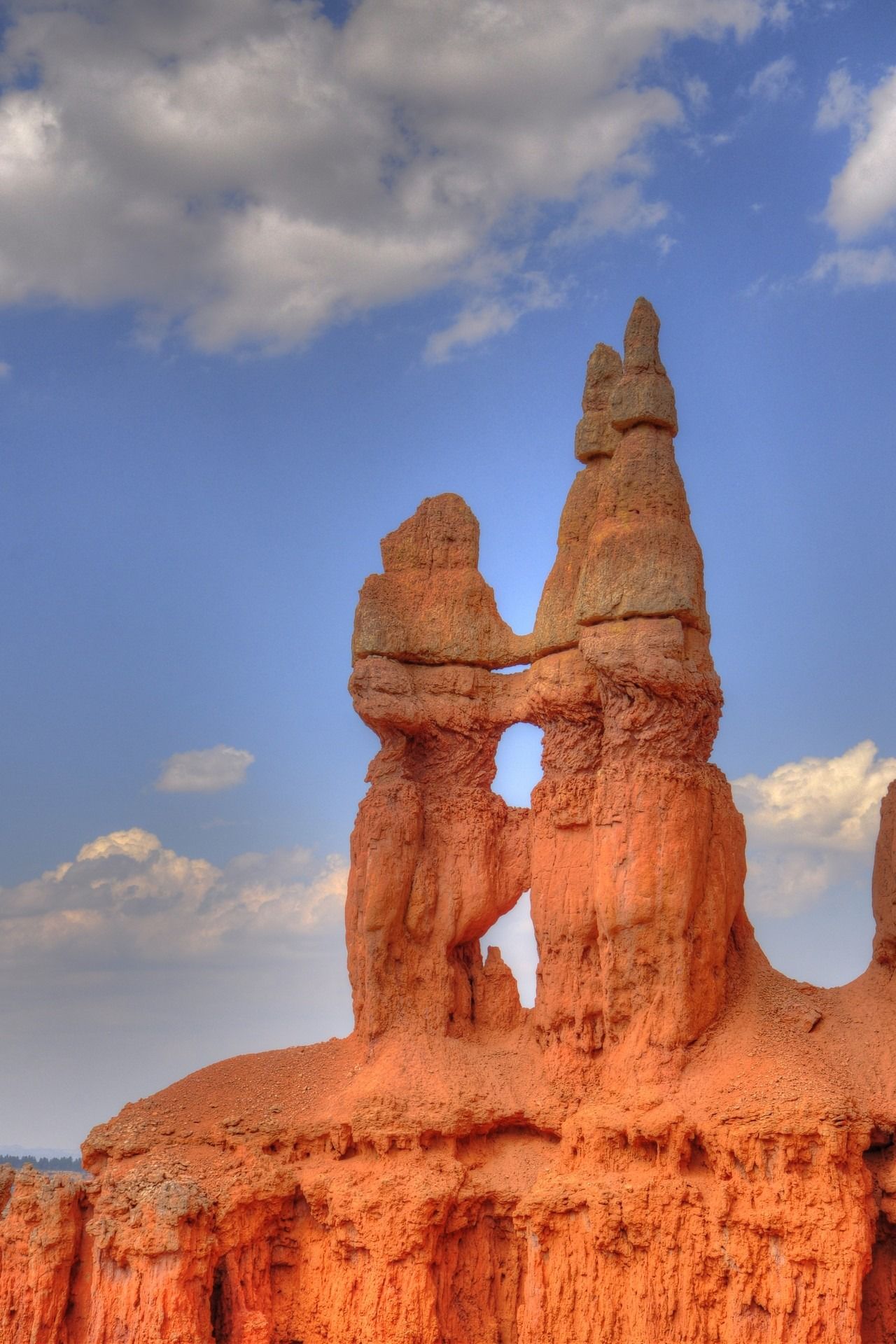 The most spectacular part of Bryce Canyon National Park, with the largest and densest formations, is thection between Sunrise Point and Bryce Point, centered on the upper drainage basin of Bryce Creek. The best trail down between those formation is probably the Peekaboo Trail, a hike of almost 9 km requiring almost 500 m descent from and then climb back to Bryce Point; as well as giving many amazing views of the main collections of hoodoos, both near and far, the path also crosses forested terrain where the more isolated formations contrast with the green and shady surroundings.