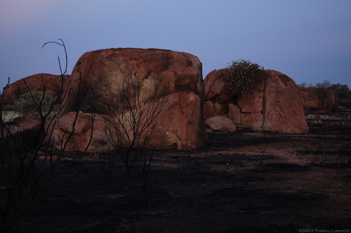 Po drodze zatrzymujemy się przy zwrotniku Koziorożca, a potem pędzimy na północ – na camping pod Kręglami Diabła. Ścisk w aucie pomagają zwalczyć marchewki, dozowane właściwie porcje alkocholu, piosenki, przysłowia, oraz konkurs fraszek. Humory dopisują. W nocy na campingu wyją psy dingo, powodując nieznaczną panikę. Większą wywołują odległe błyskawice, jednak szybka ocena kierunku wiatru i odległości pozwala kilku osobom dotrwać do rana śpiąc pod pięknym rozgwieżdżonym niebem. Po raz pierwszy widzę Wielki i Mały Obłok Magellana.